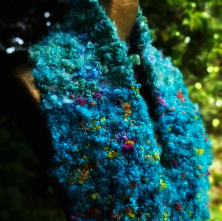 This listing is for a luxurious, flamboyant and very eye-catching wearable art scarf crafted from the lustrous locks of high welfare Wensleydale sheep. The yarns used in the scarf are from two dye-batches: the first was dyed for the flock owner and was bought from them. The second were colour-matched for me by the same dyer so that they would blend harmoniously.
