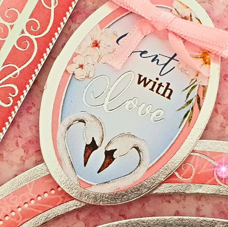 It is decorated with coordinating silver foiled toppers, and the sentiment tag "Sent With Love". It is also embellished with pink craft gemstones and a matching ribbon bow.