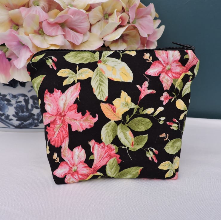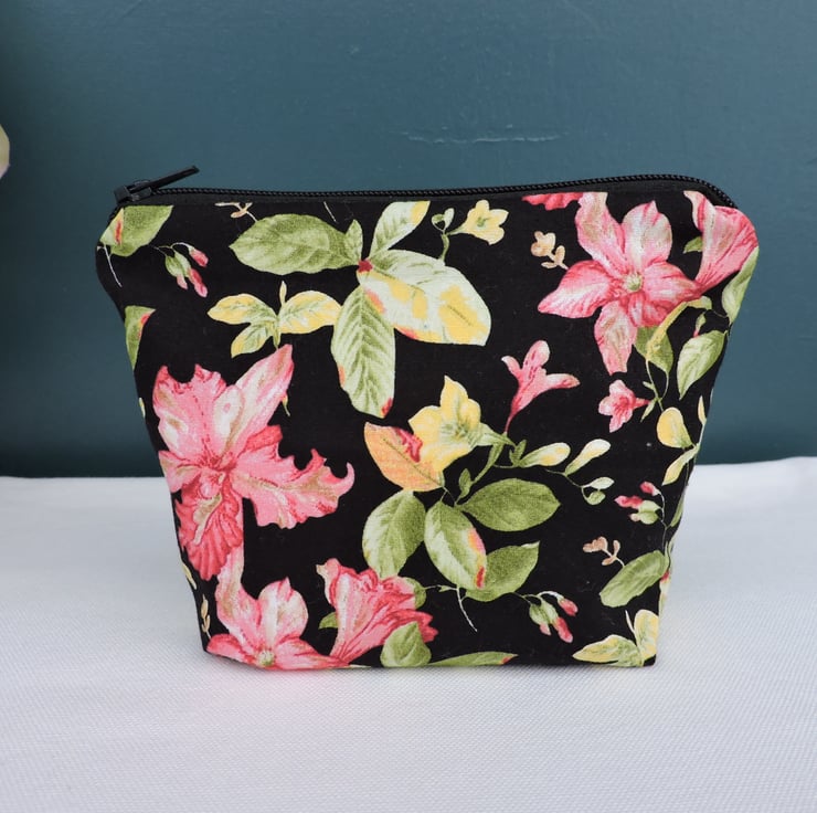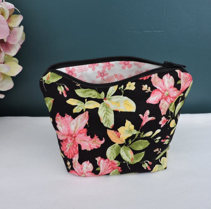 Sale A zipped pouch is made with cotton fabrics. An outer fabric which has a black background, pink and yellow flowers with green leaves. The inner is a white and pink floral fabric. It has a squared off bottom and is finished with a black top zip.