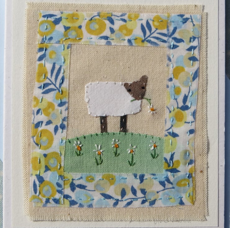 A unique hand-stitched miniature applique cut from my own hand-dyed recycled cotton with embroidered details. The borders are cut from a pretty Liberty cotton print, everything hand-stitched into place. Suitable for child's birthday, new baby, Christening, Baby Shower, Easter........