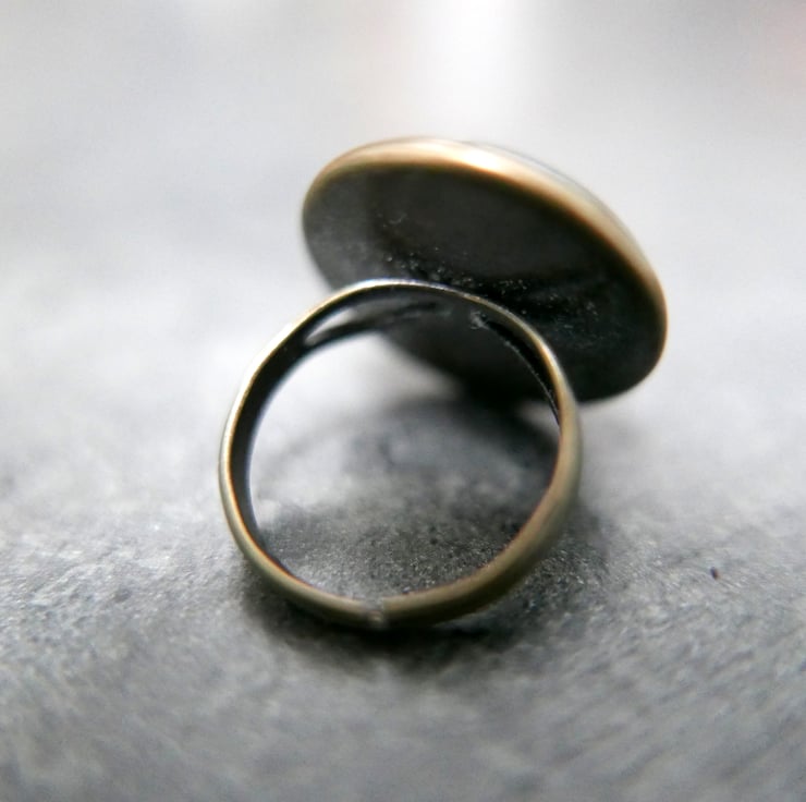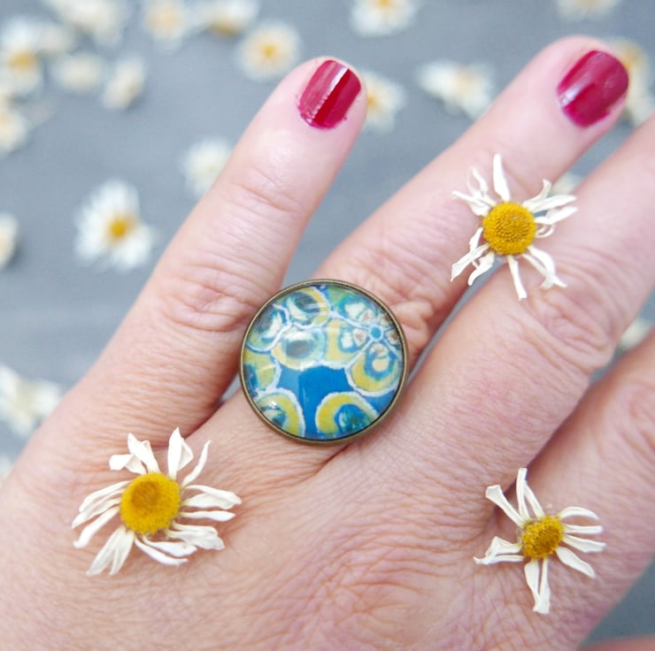 I love creating jewelry using prints after my paintings and for this ring, I used a mini print of my original mixed media painting titled 'Petals in the Moonlight'. The image is printed at home on a 300 gsm card and it's glued onto the ring setting and fixed under a glass cabochon that measures approximately 1" round. The ring is adjustable so it fits most sizes.