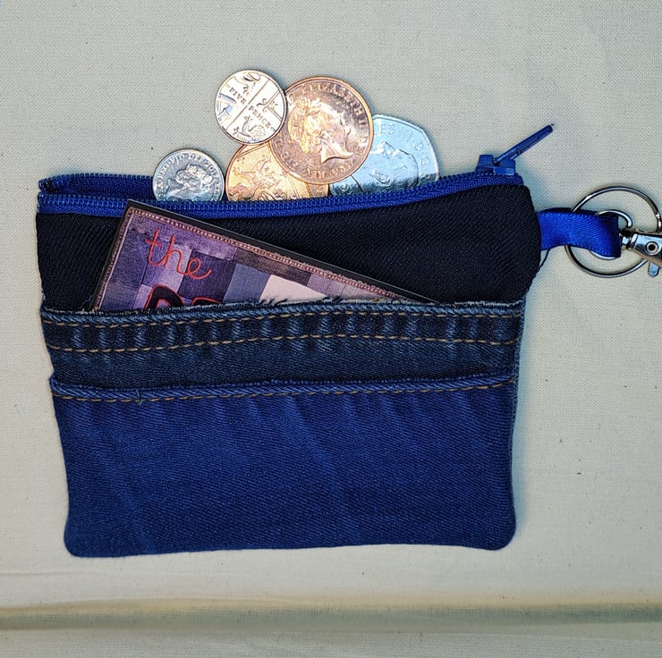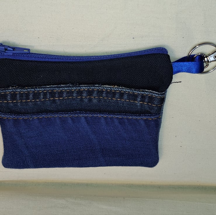 This coin and card purse is the perfect small purse. It has loads of space for its size, comprising of the main zipped and secure section for coins and notes then 2 more pockets for cards, receipts and other bits and bobs. It has a key ring attached with a ribbon, to secure it to your keys or bag. It measure 12cm (5") x 11cm(4.5"). It's made from 4 different pairs of jeans, resulting in a very unique combination and a one of a kind purse, never to be repeated. It has a small 4cm (2") piece of ribbon sewn into the seam with a clip and keyring secured on it. The zip and ribbon coordinate to further personalise the appearance.