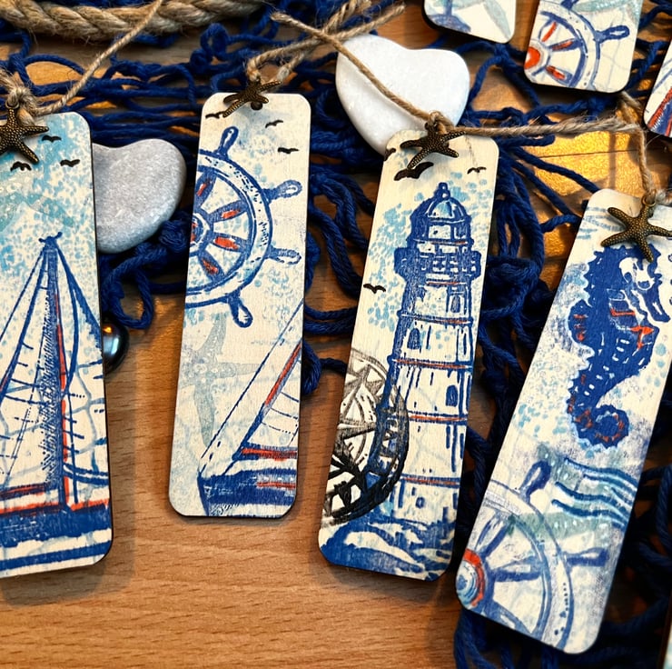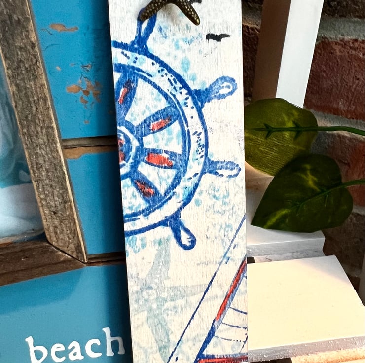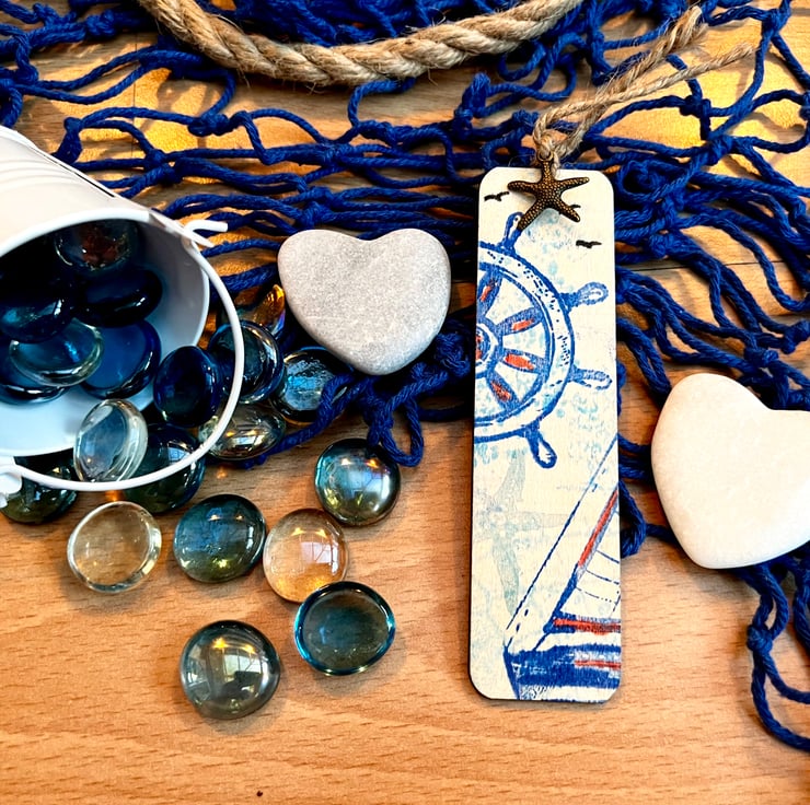 'Sailboat wheel’ Bookmark. This handmade wooden bookmark is approximately 12x3cm in size and can also be used as a decorative item.