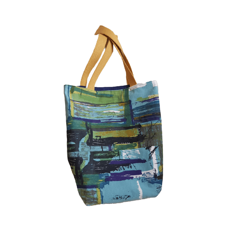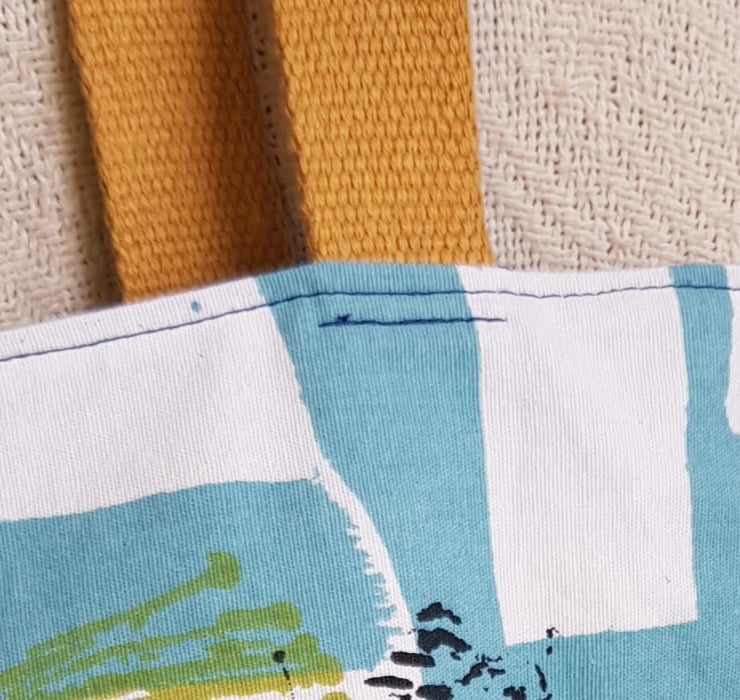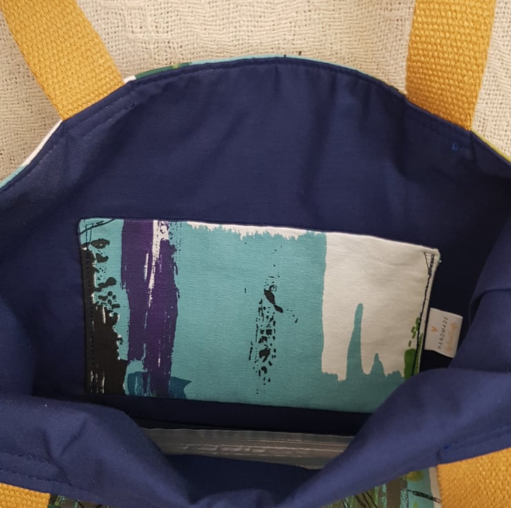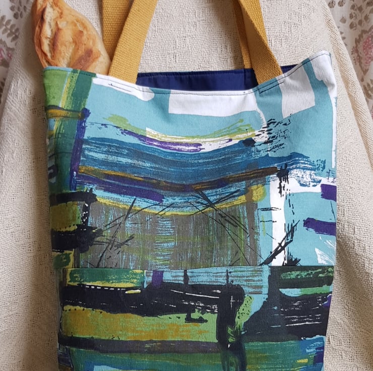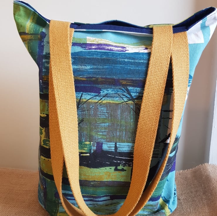 I have chosen a vintage abstract print cotton furnishing fabric which I have interfaced to give added strength. The bag is fully lined with a dark blue cotton and has an inside pocket.