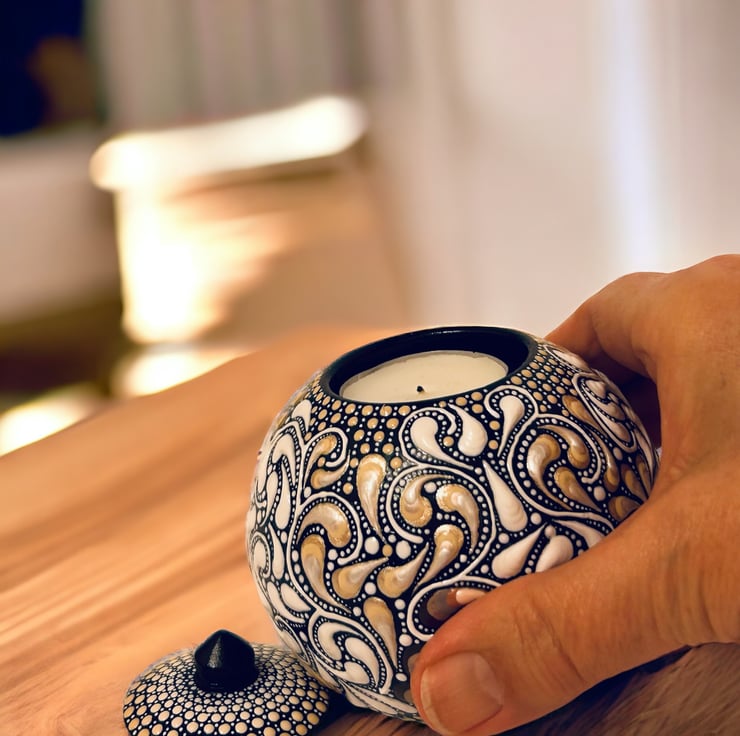 An exquisite handcrafted spherical tea-light holder with matching lid.