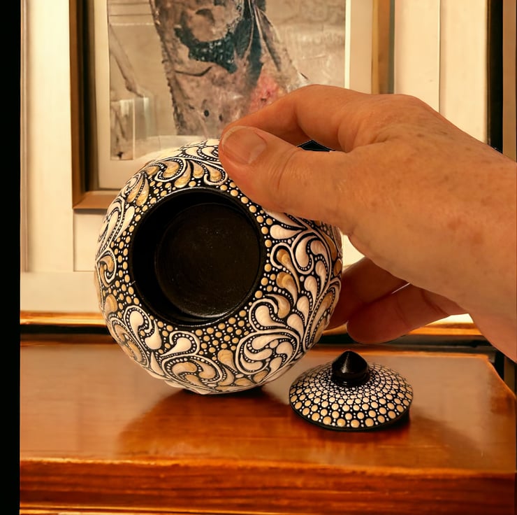 Finished in a high gloss varnish, it is not recommended to use the lid to extinguish a live flame.