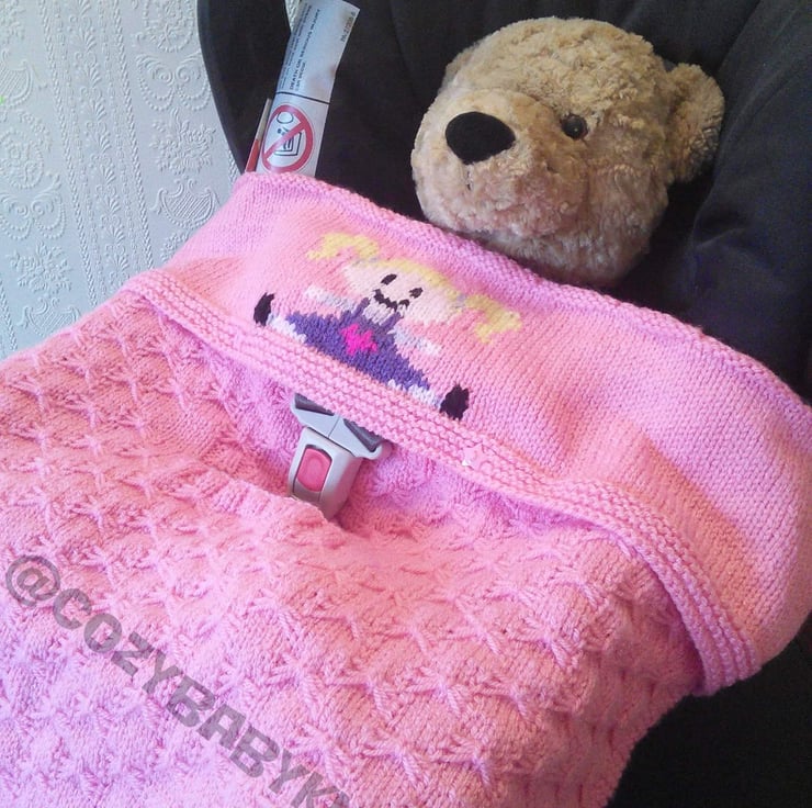 The car seat blanket is made for the first size car seat. Has two holes for the 3 point harness to go through. It means that when you carry the car seat the blanket is secure. But the clasp is visible so easy to unfasten.