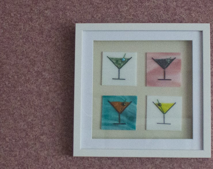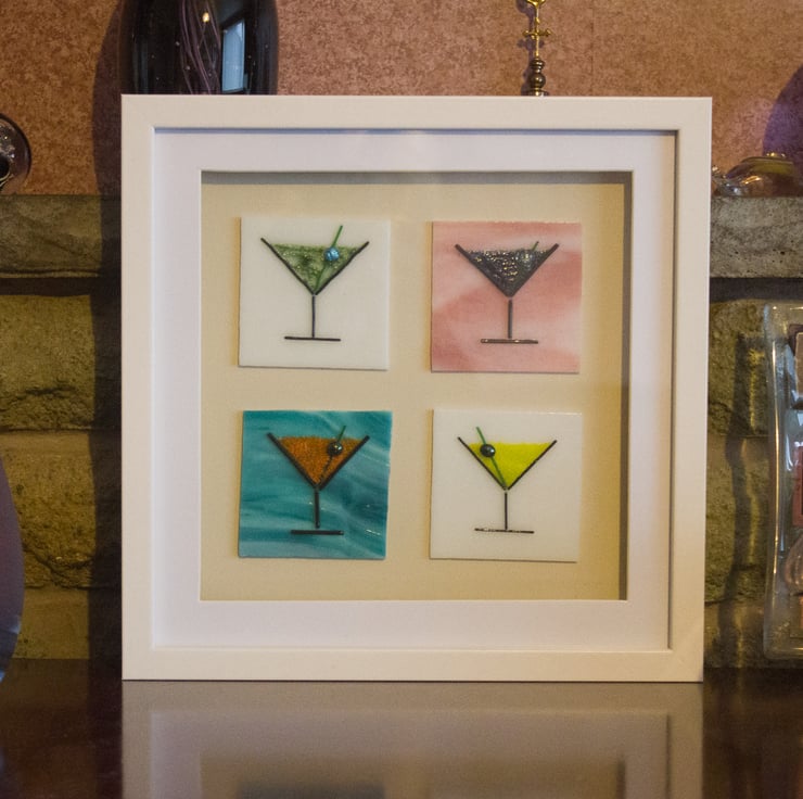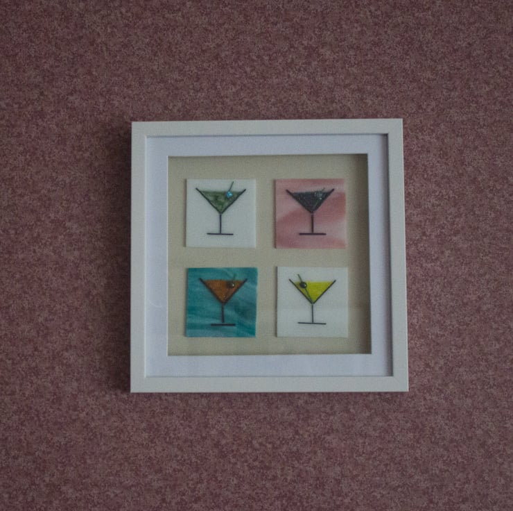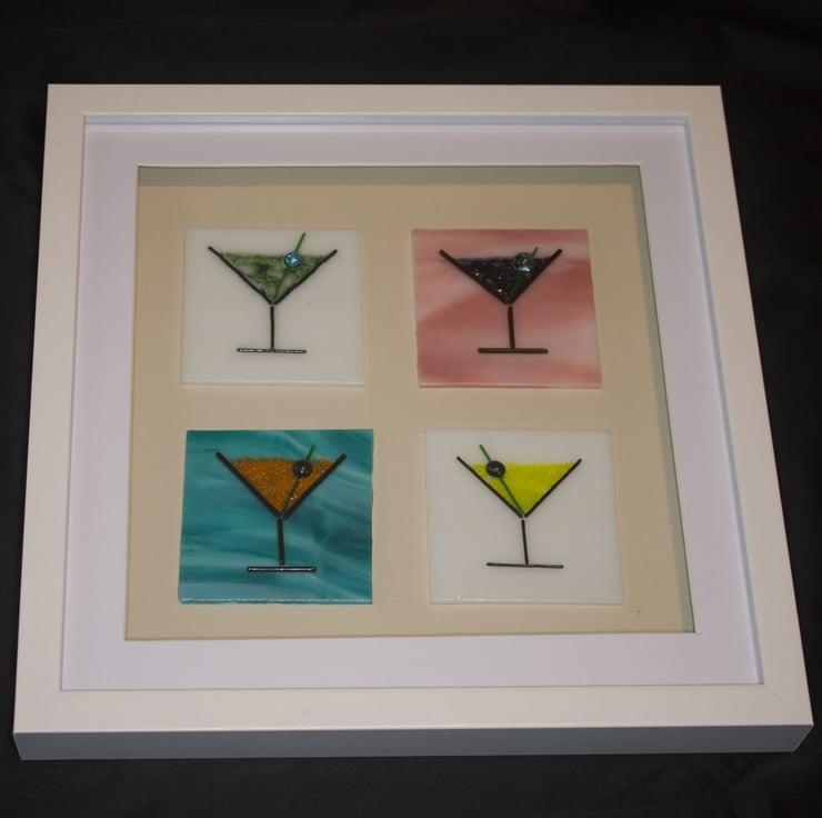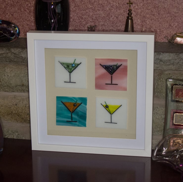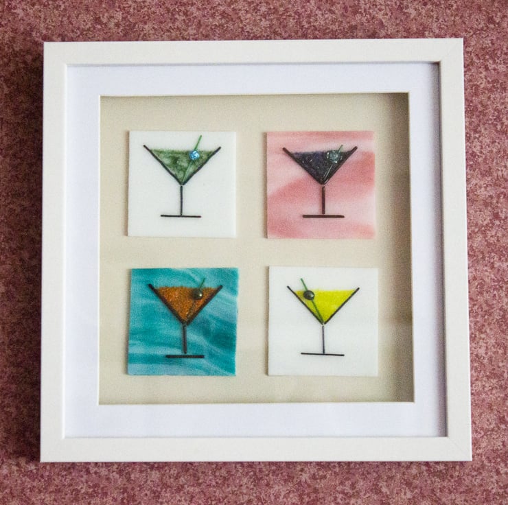 Each of the four plaques is made from a 7 x 7 cm of sheet glass onto which the glass outline has been laid out using thin glass rods (stringers). The cocktail is made from small glass granules, and it's all topped off with a glass bead 'olive'. A session in the kiln fuses everything together but retains a 3D texture to the piece. The plaques are mounted on a mushroom-coloured mount in a shadow box frame that is 27cm square.