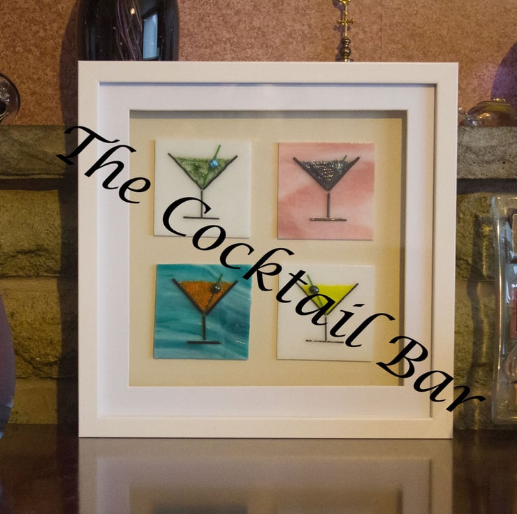 'The Cocktail Bar' is a unique collection of our mini-cocktail plaques mounted in a shadow box frame. Each of the 4 plaques in this piece of Fused Glass Art has been carefully created by hand. It will make a great gift for any cocktail lover.