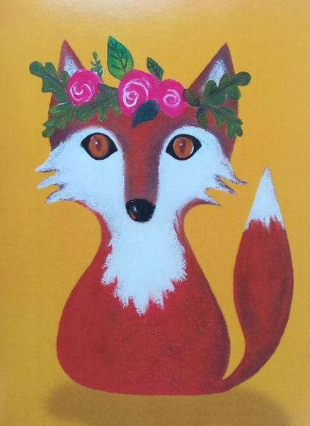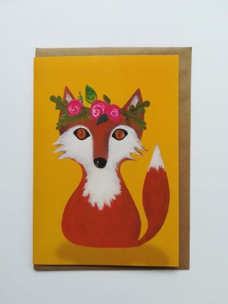 A pretty little fox wearing a garland of flowers, leaves and acorns.