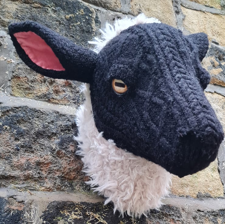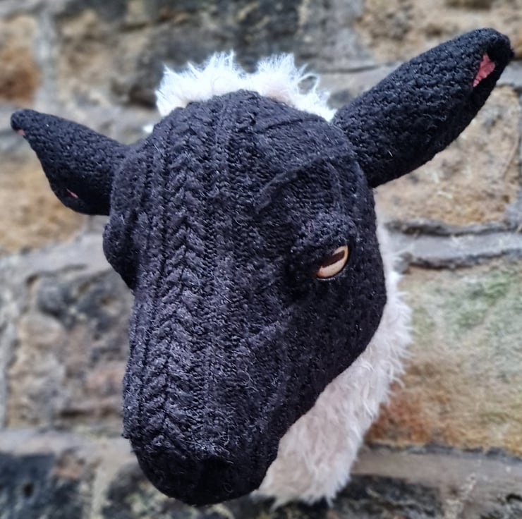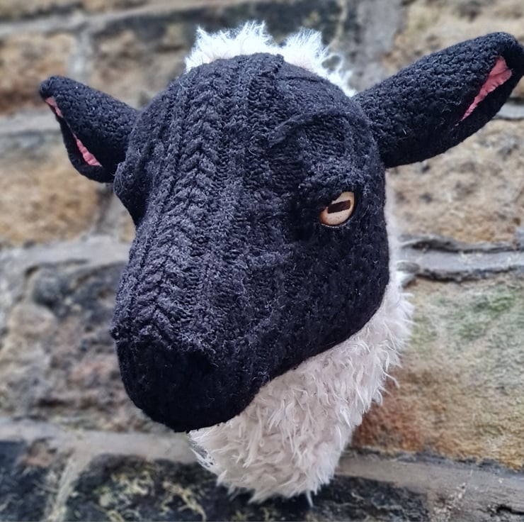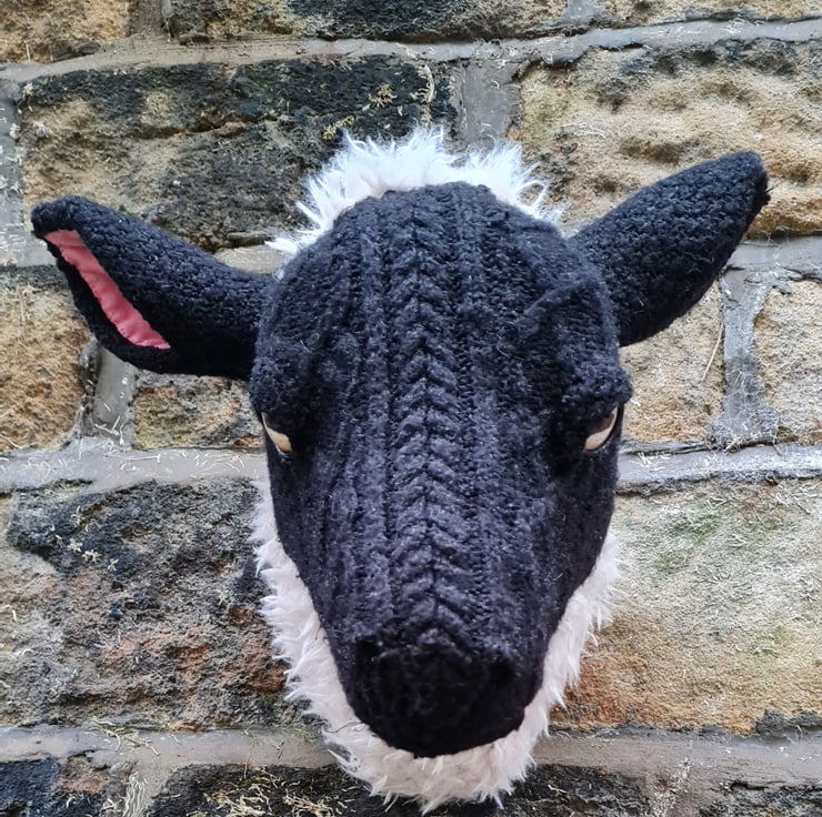 A lifesize faux black sheep head which I have cast myself and covered in hand stitched faux sheepskin and an upcycled black aran jumper.