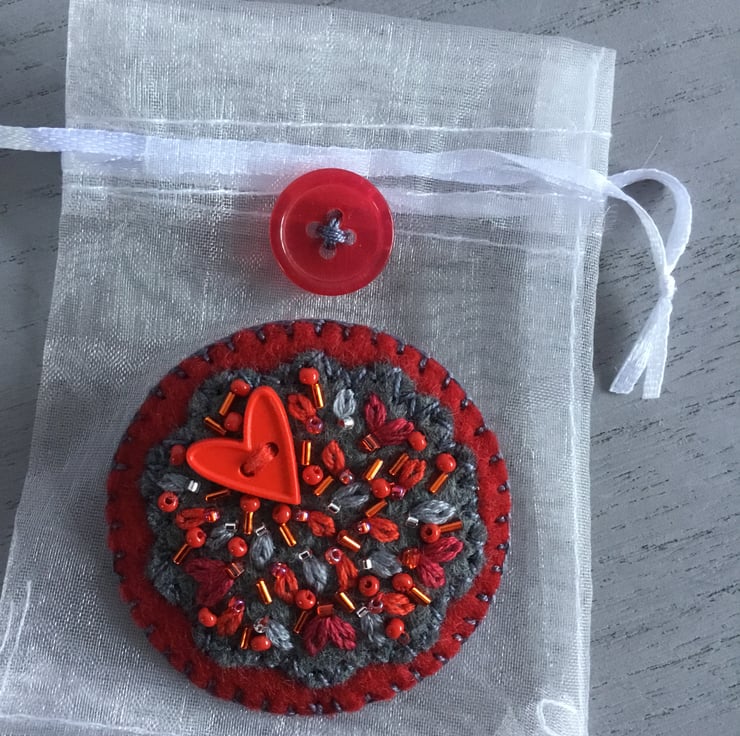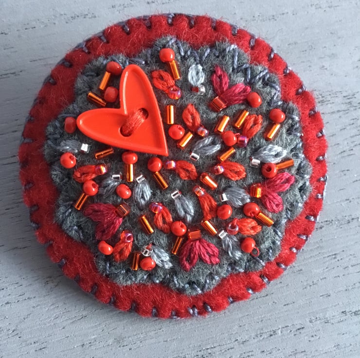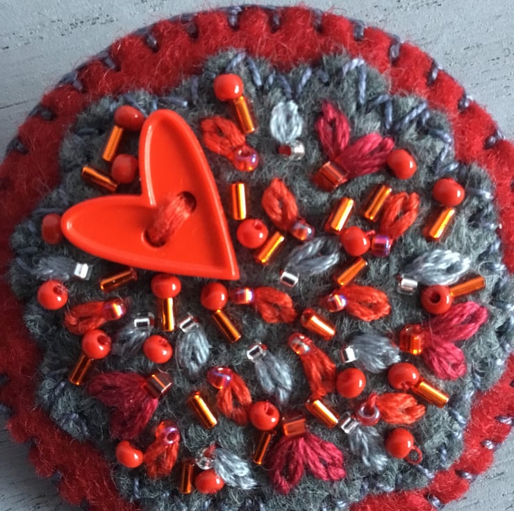 This Hand Embroidered Circle Heart Brooch has a small red Heart button stitched onto circles of red and grey felt. This Heart button is surrounded by hand embroidered Lazy Daisy Stitches in grey, ruby and red embroidery threads, with seed and bugle beads in red and crystal colours.
