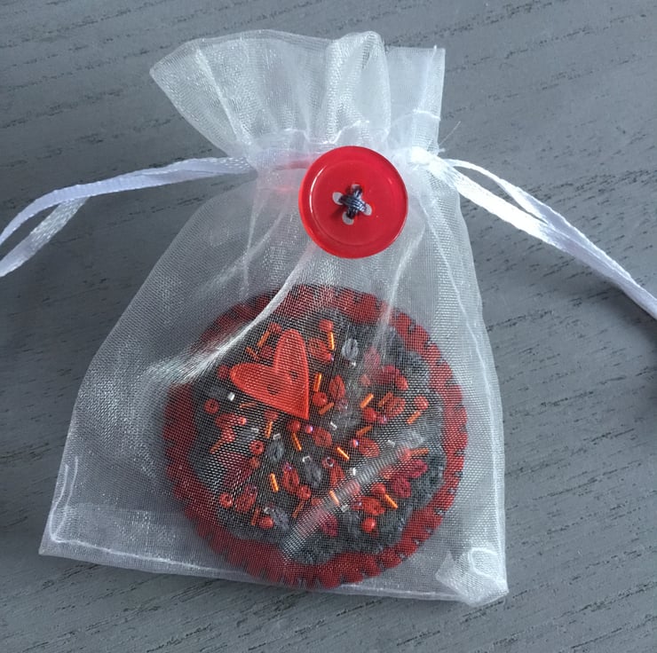 This Hand Embroidered Circle Heart Brooch is gift wrapped in an organza bag, decorated with a red button. A protective bag to keep the brooch in when not worn.