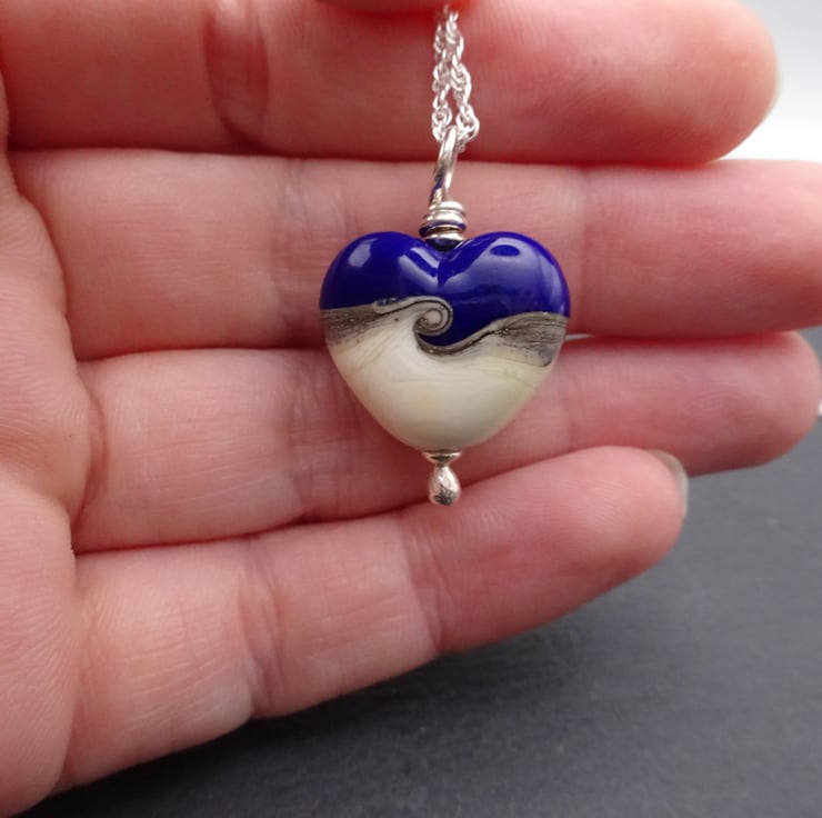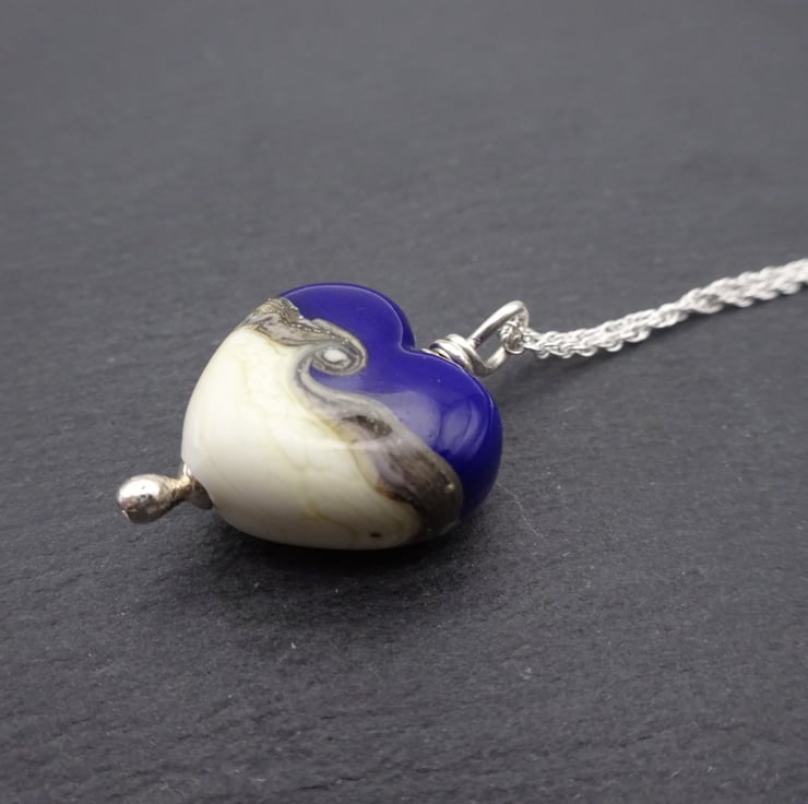 The pendant has been handmade by me using blue and ivory glass and shaped into a heart.