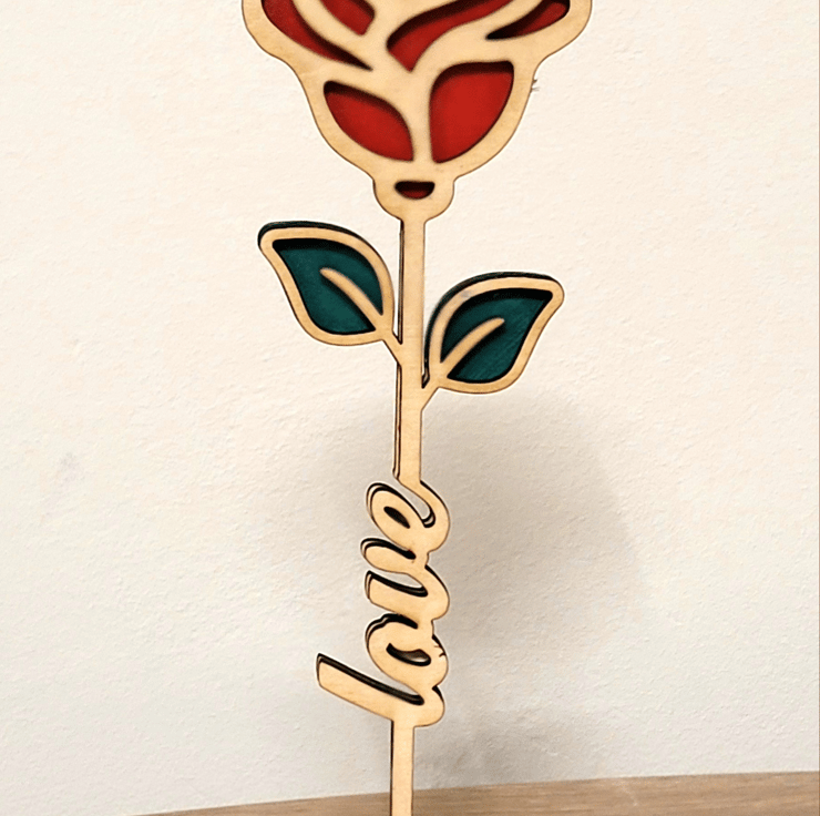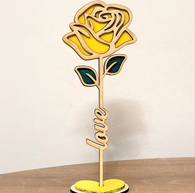 An ideal gift for valentines, mothers day, birthdays and anniversaries this beautiful laser cut and hand painted rose with its own stand and enscribed with the word love.