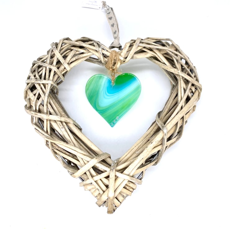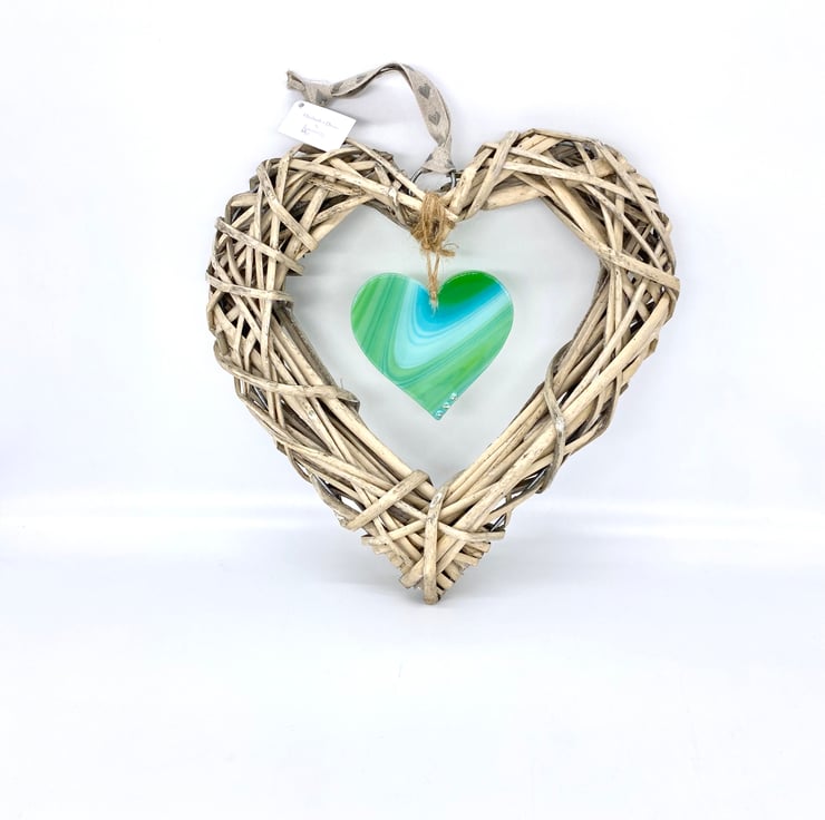Wicker heart measures 25cm and the glass heart is 8.5cm.