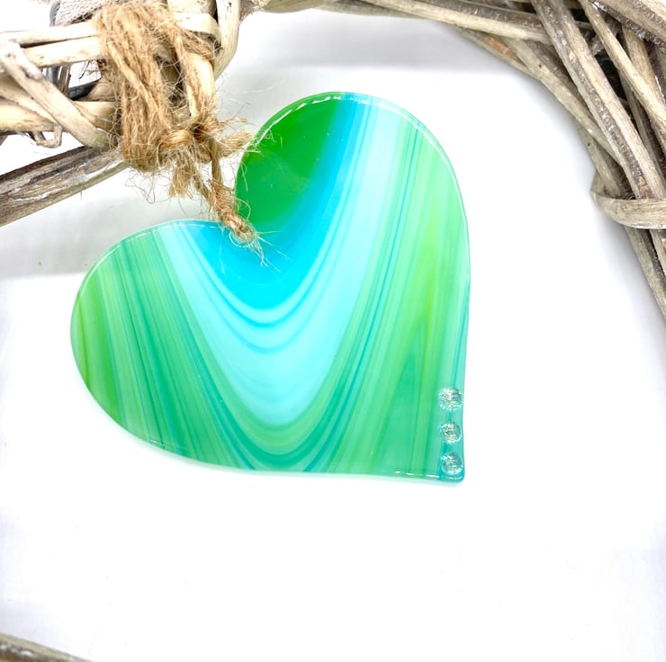 A gorgeous large heart made from beautiful green & turquoise art glass with 3 silver dichroic beads fused to it.