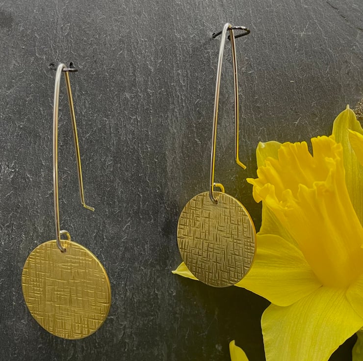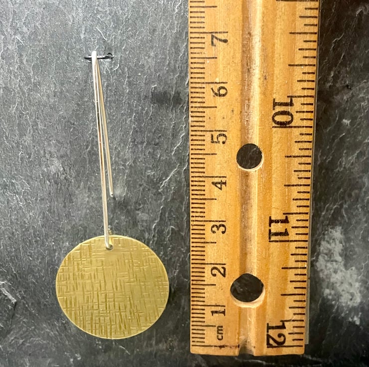 Brass disks, that have been hammered, oxidized and lightly to create a one of a kind everyday earring. Hand shaped sterling silver ear wires finish the look of these unique brass and silver earrings.