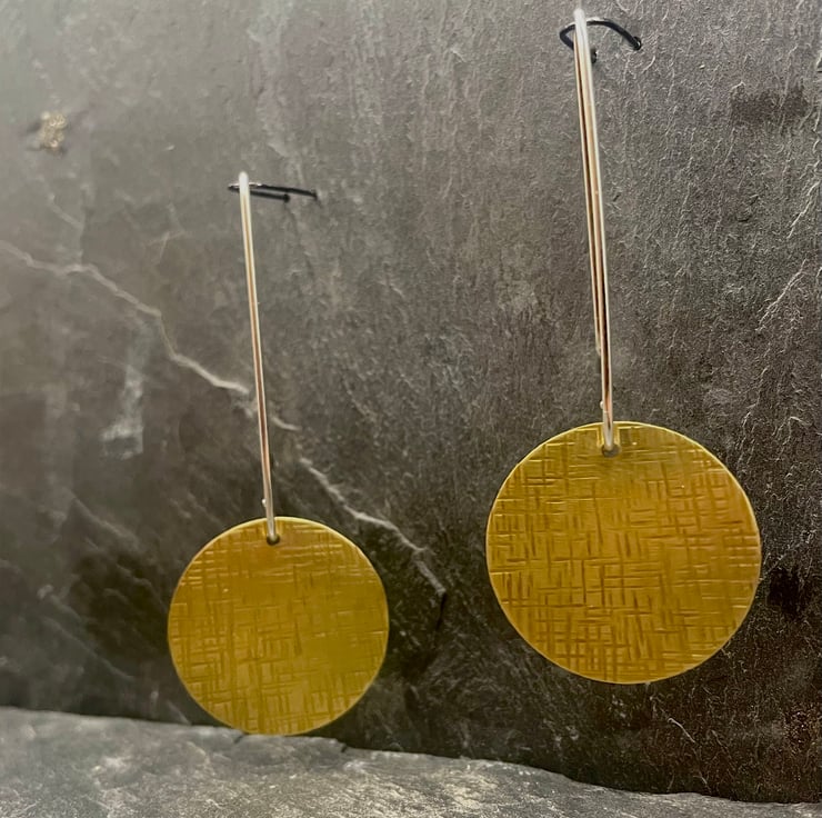 The drop is 6.4cm, the disk itself has a diameter of 2.6cm. Weight is 4g per earring.