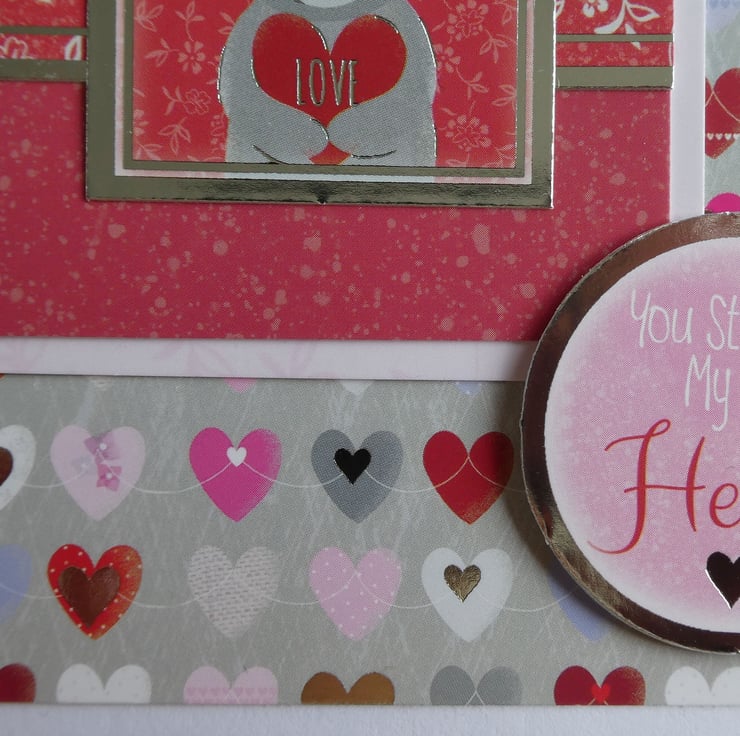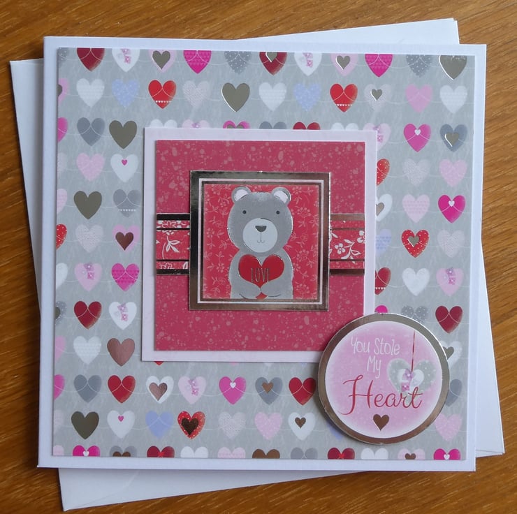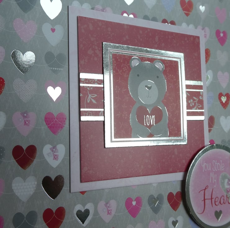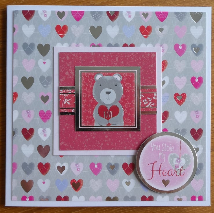 The image is framed with silver foil and mounted onto layers of soft red and pale pink card then onto a white card base before being finished with a round message with the words 'You Stole My Heart'.