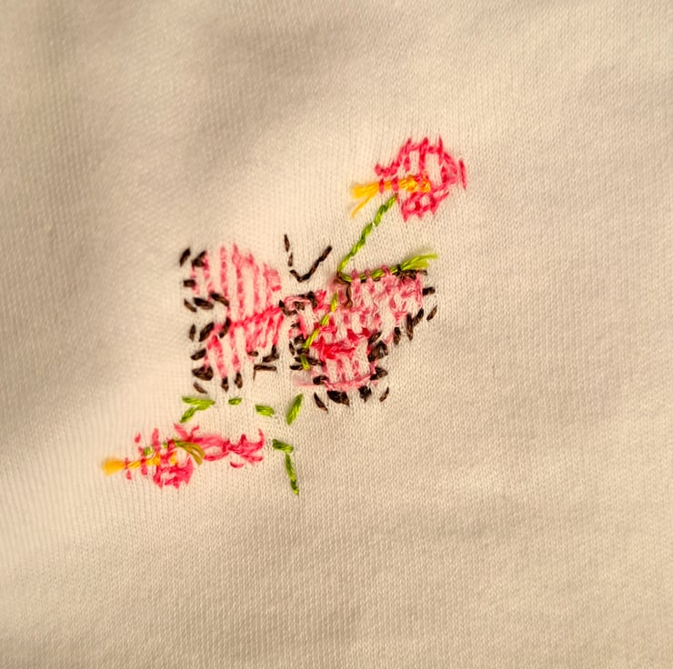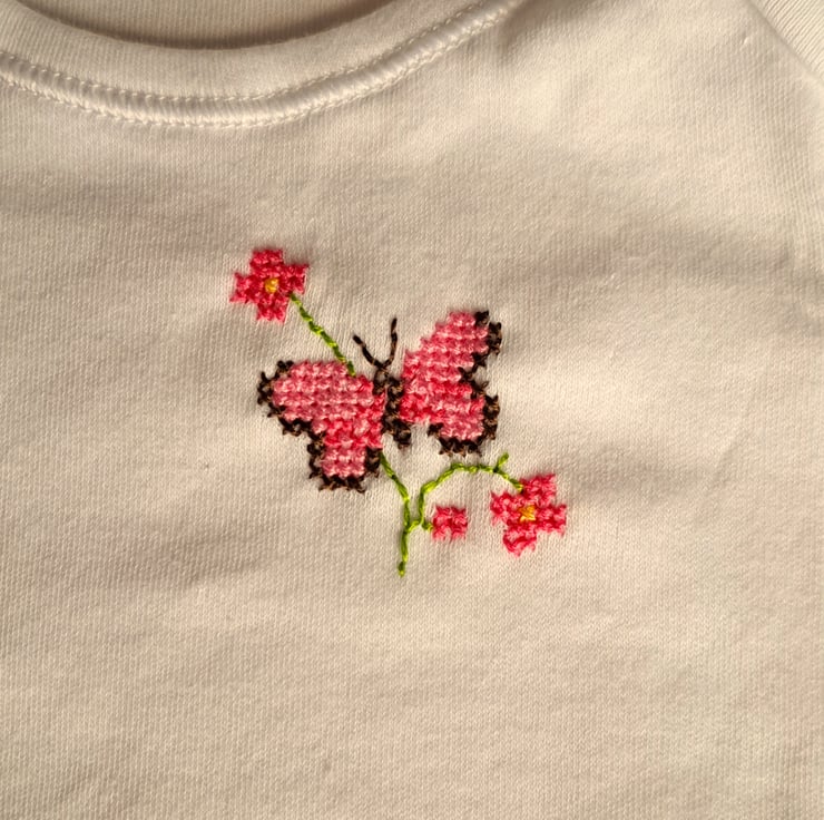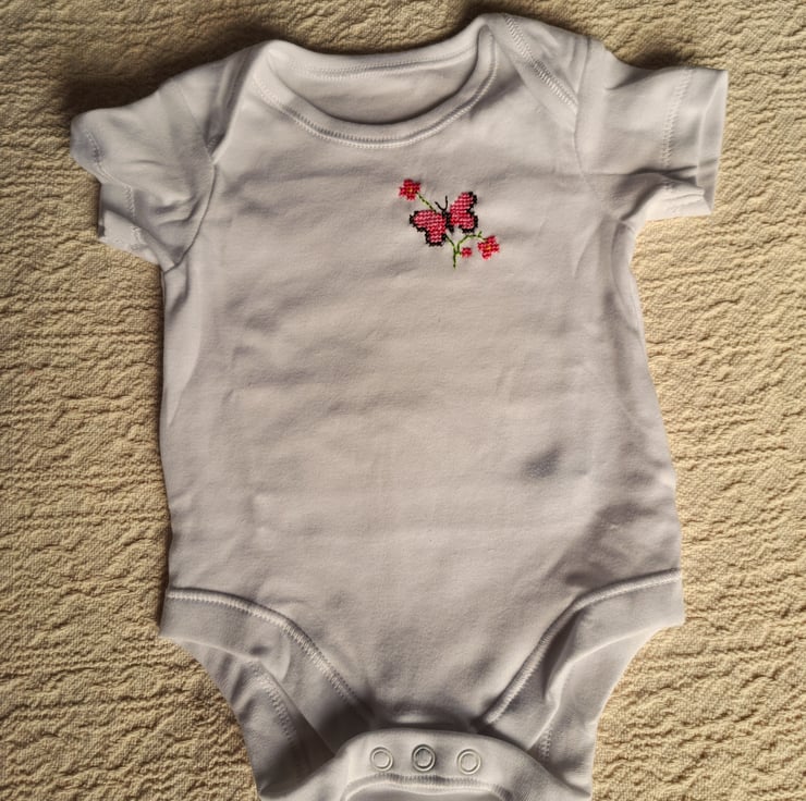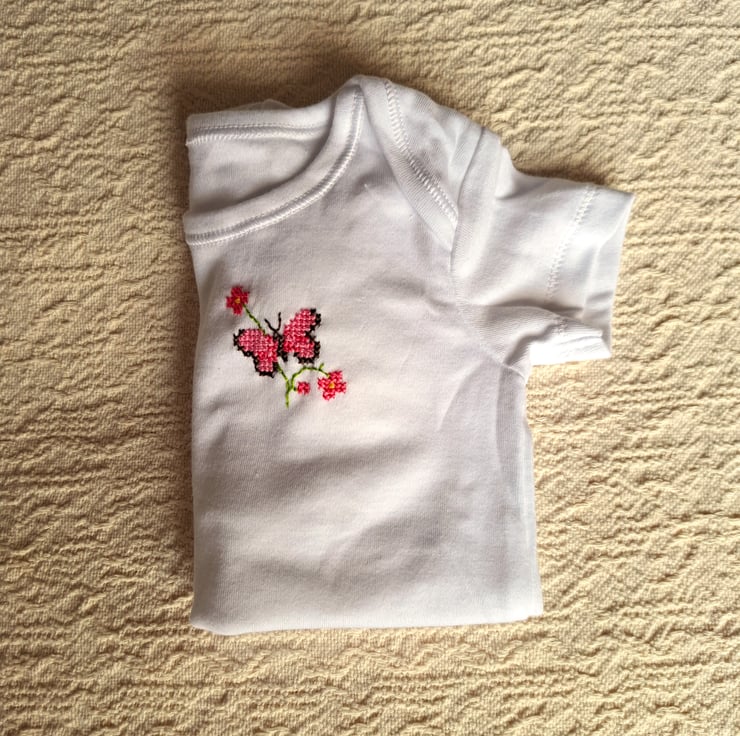 I have made this soft white cotton baby vest very feminine by hand embroidering a pink butterfly visiting toning pink flowers on the left front. The vest/onesie has an envelope neck, short sleeves and three press studs between the leg openings. As I never use a permanent backing material when hand embroidering kids' clothing, there is nothing inside this garment to irritate your child's skin. It is machine washable.