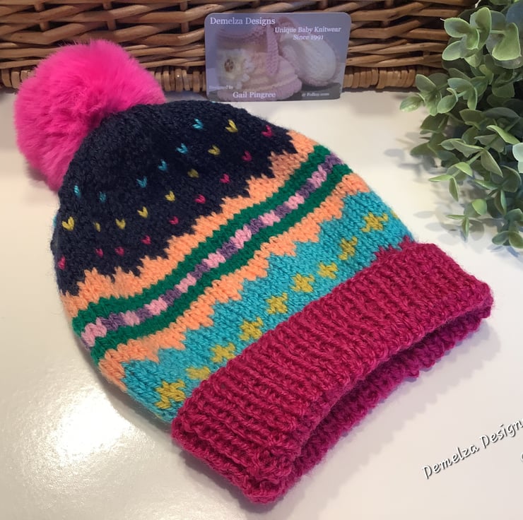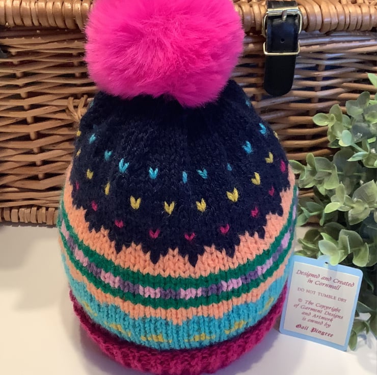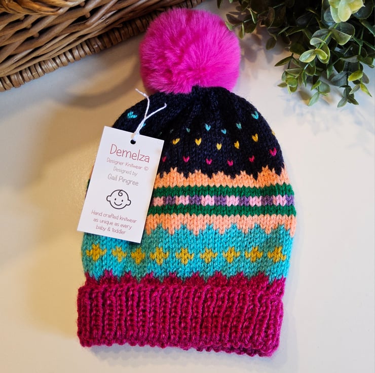 An adorable colourful cosy warm toddlers fairisle beanie pompom hat designed and hand crafted in Cornwall using quality branded premium acrylic yarns. It will make a perfect unique quality gift for any little girl.