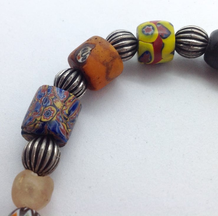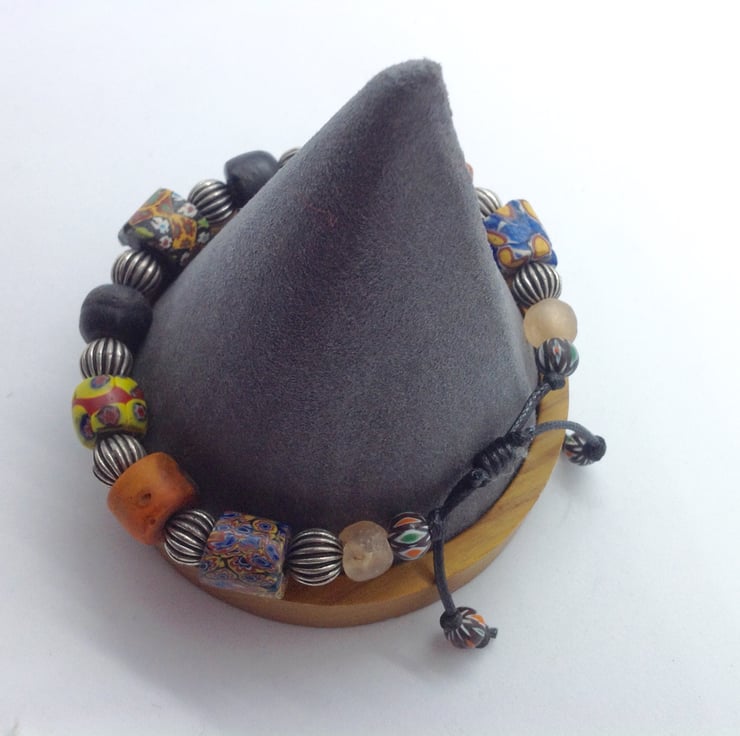 This handsome bracelet has 5 antique trade beads, 2 vintage Himalayan 'face' beads and some North African style silver tone beads and a couple of beads made from recycled glass bottles, jars, etc.