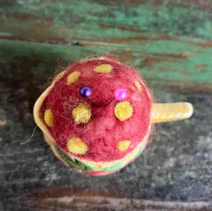 The cushion is made from needle felted wool with a spotty pattern and it will hold your pins and needles safe and secure.