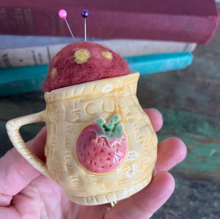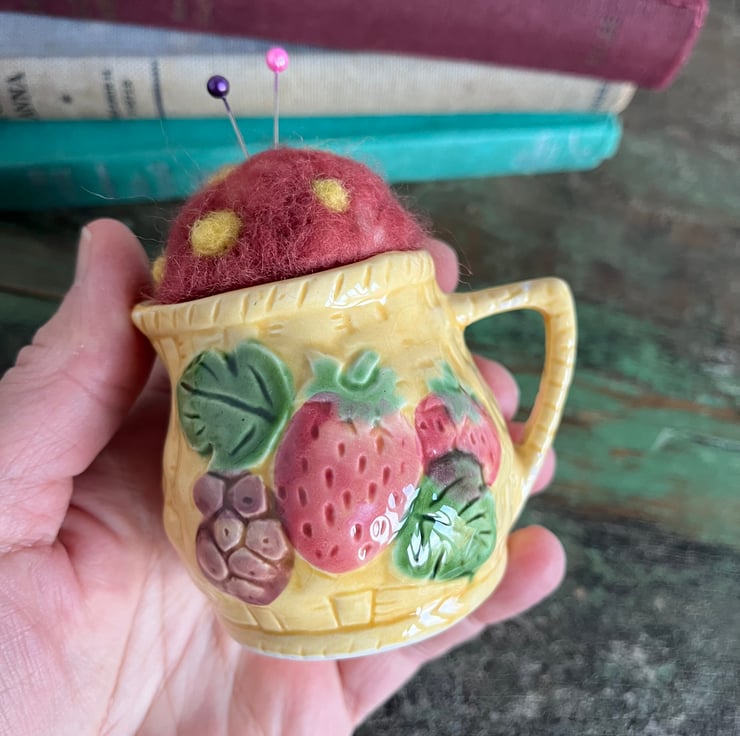 Cute little pincushion in a half cup measuring jug found in a charity shop. The jug has a raised strawberry design. There are a few little chips in the glaze making it perfect for repurposing.