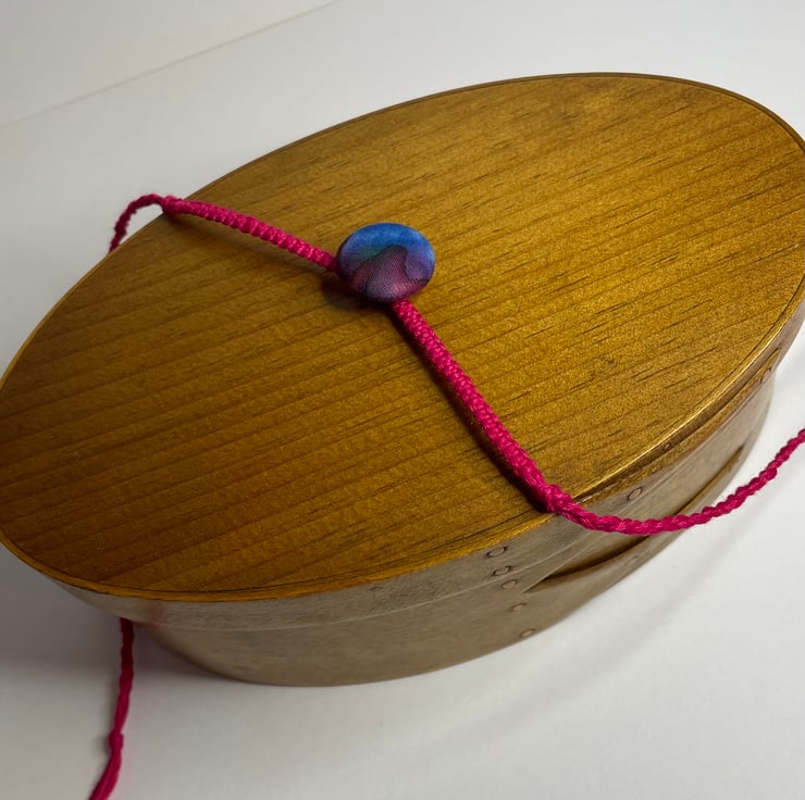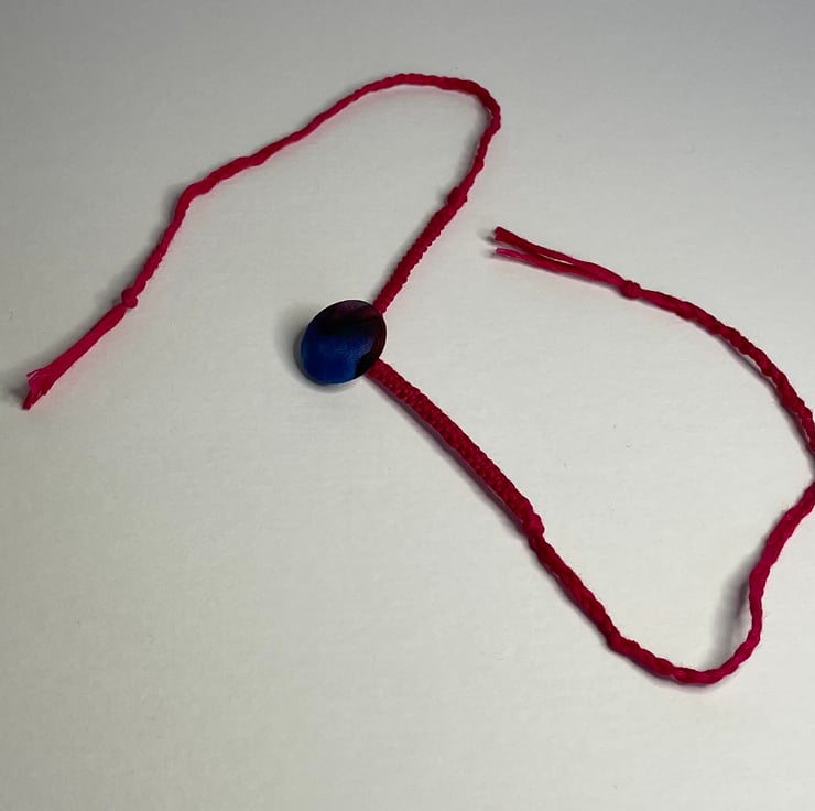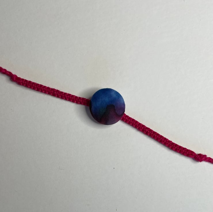 The button is hand covered in a watery pattern cotton fabric and the band has been hand woven, from a cotton yarn, using a plaiting and macrame technique.