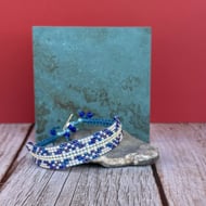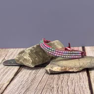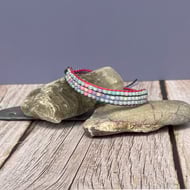 The button is hand covered in a gold accented cotton fabric and the band has been hand woven, from a cotton yarn, using a plaiting and macrame technique.