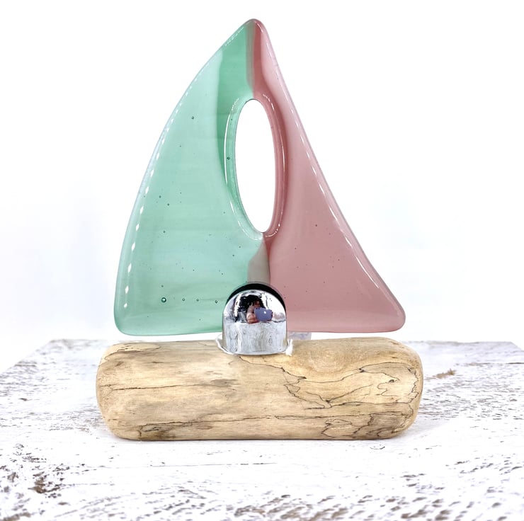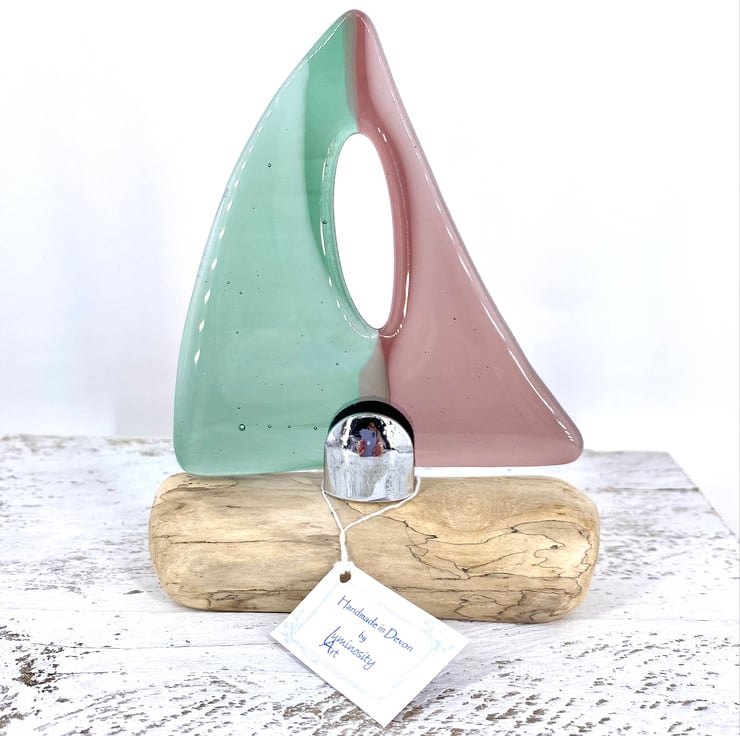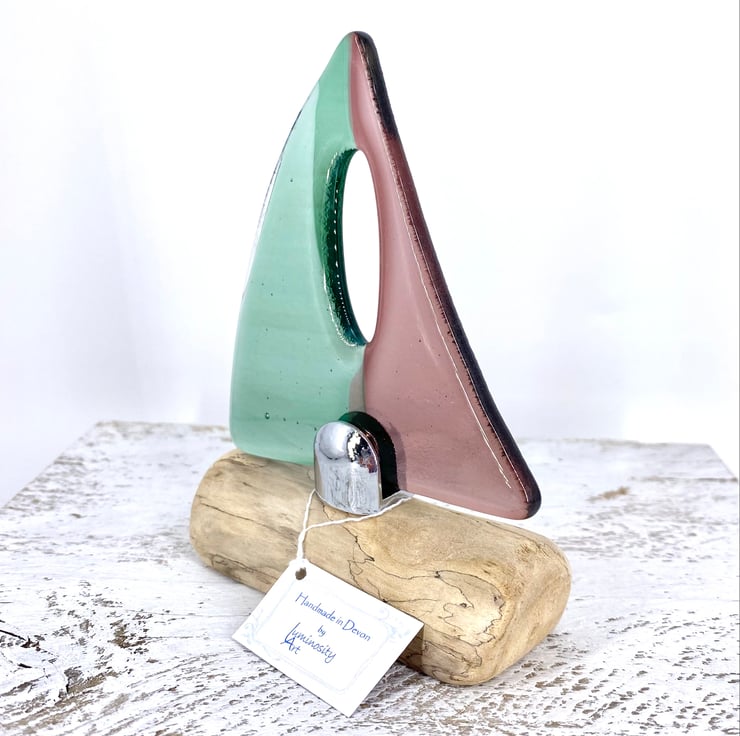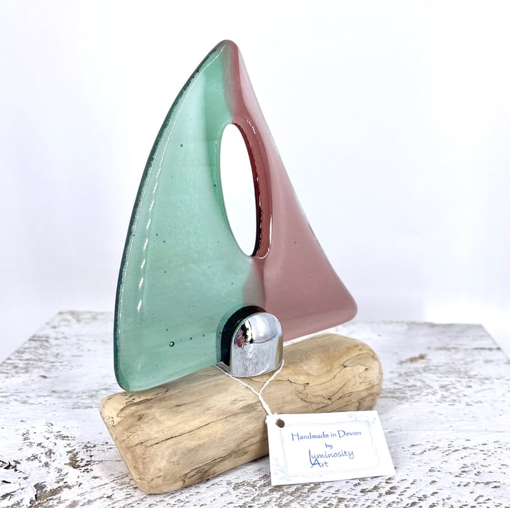A pretty decorative sailing boat. Delicate wispy sea green and dusky pink glass sails set on a gorgeous piece of drift wood which had been washed up on the Devon coast.