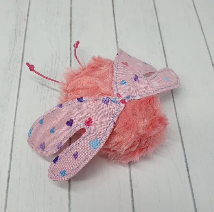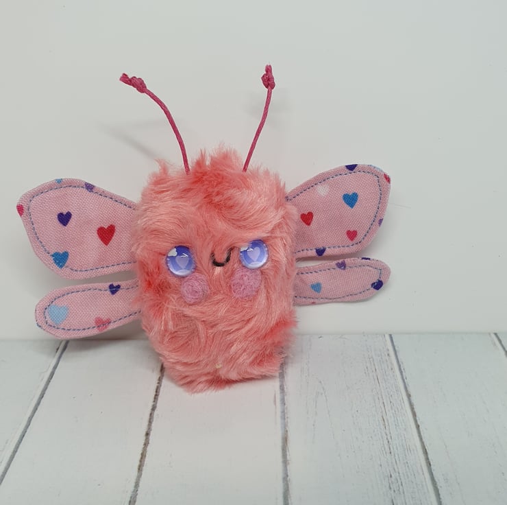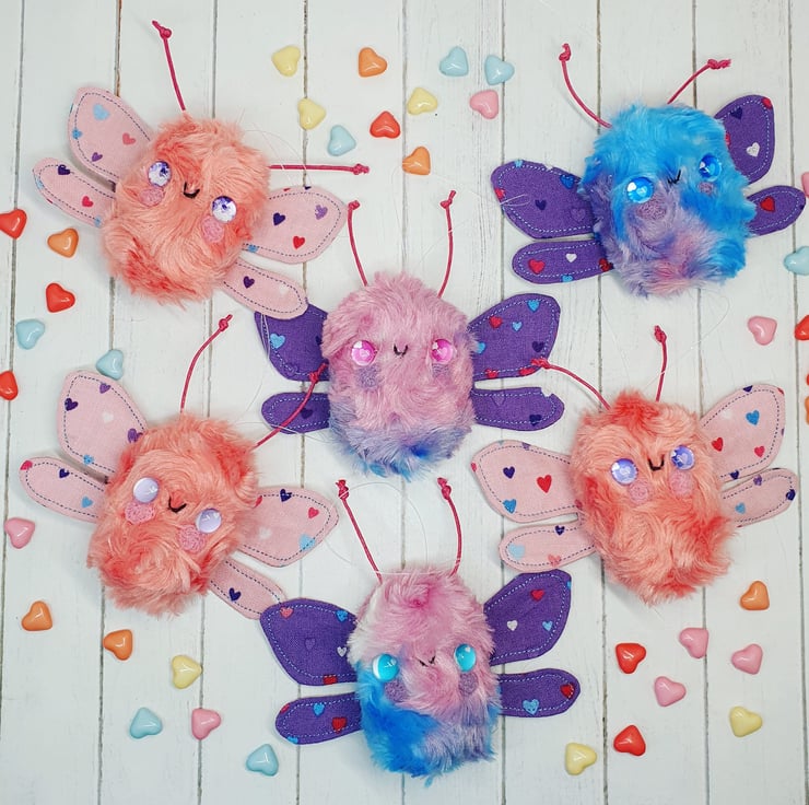 Small plush love Bug with glass eyes and heart print wings. Wings are sewn into place. Love Bug has waxed thread antenna and hand embroidered smile. Love Bug comes with transparent loop hanger and measures roughly 7cm tall with a 10cm wingspan. This listing is for one love Bug only. This is for decorative purposes only and not a toy.