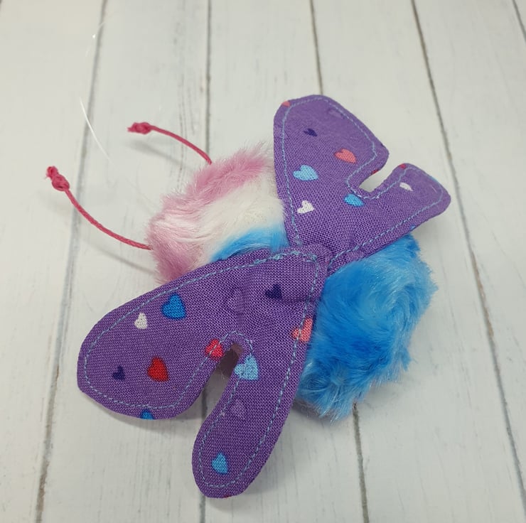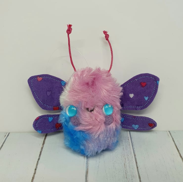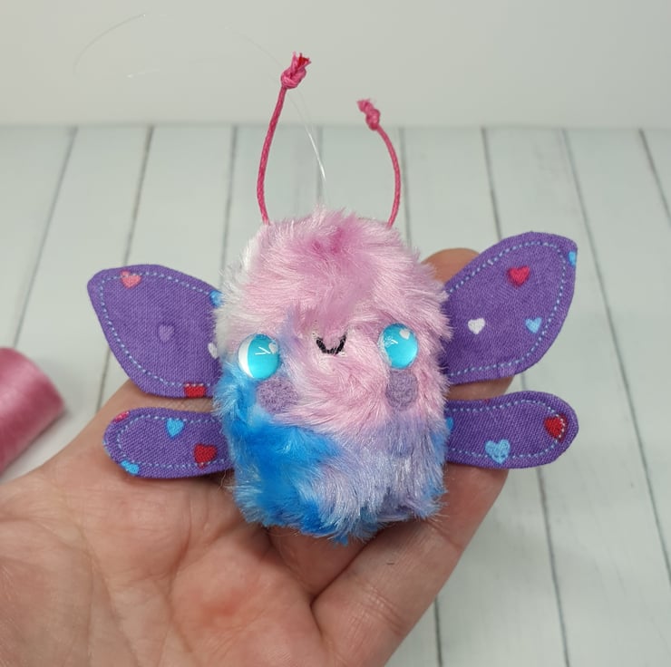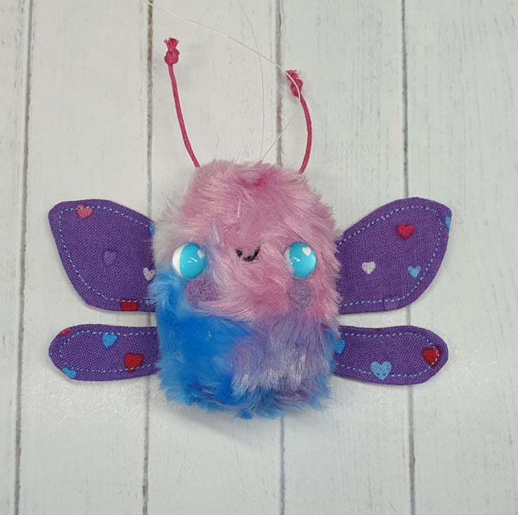 Small muti coloured plush love Bug with glass eyes and heart print wings. Wings are sewn into place. Love Bug has waxed thread antenna and hand embroidered smile. Love Bug comes with transparent loop hanger and measures roughly 7cm tall with a 10cm wingspan. This listing is for one love Bug only. This is for decorative purposes only and not a toy.
