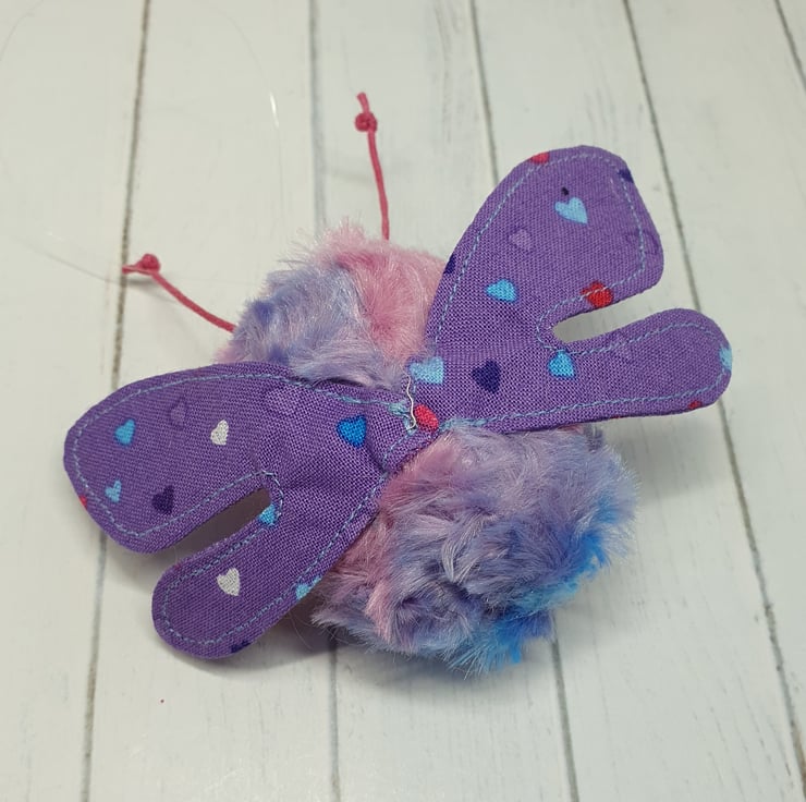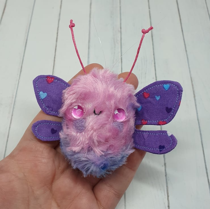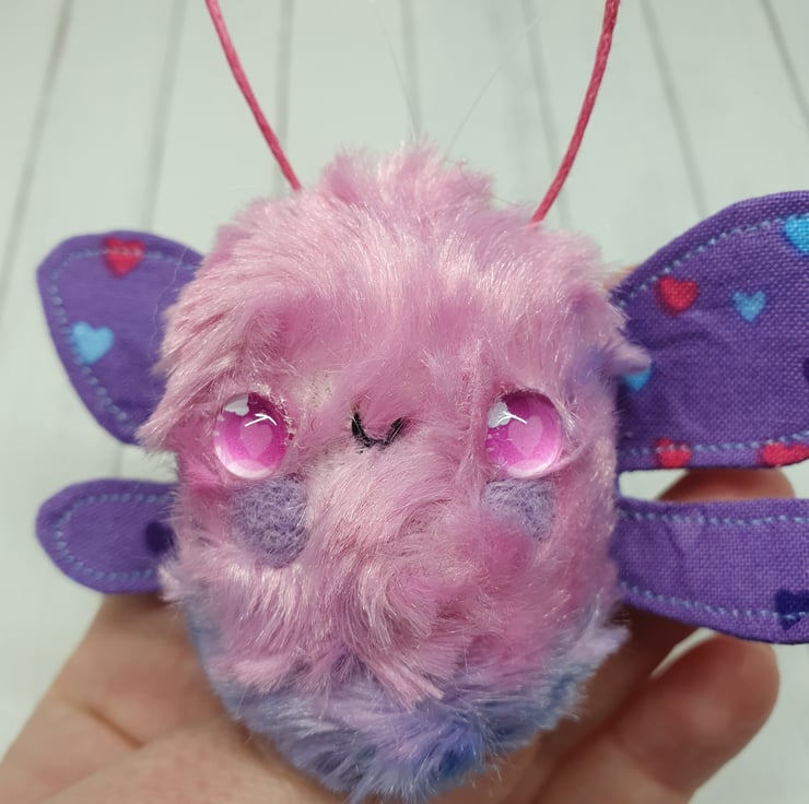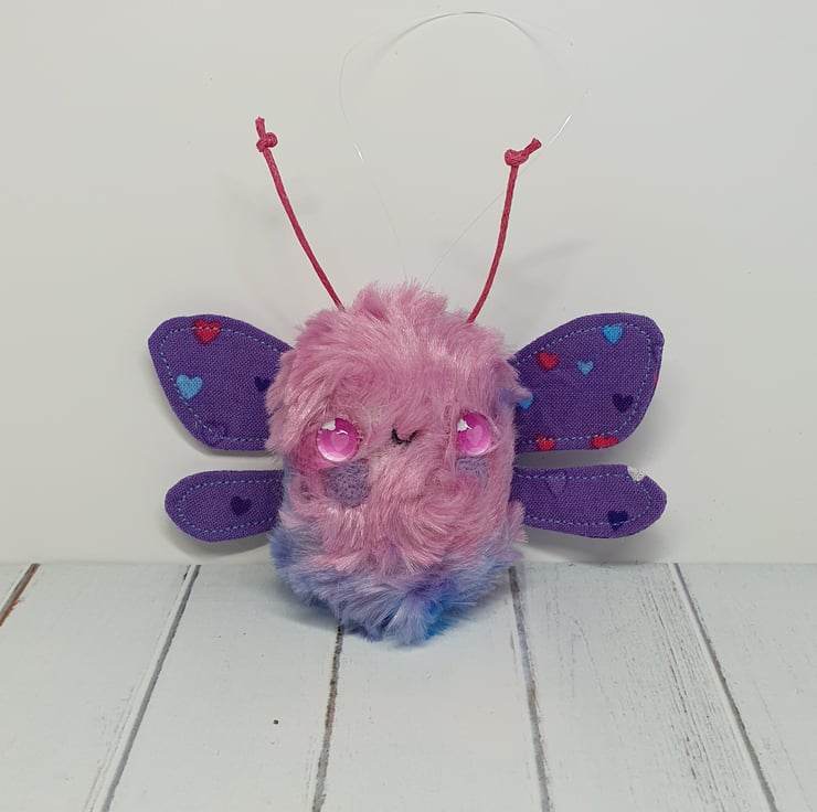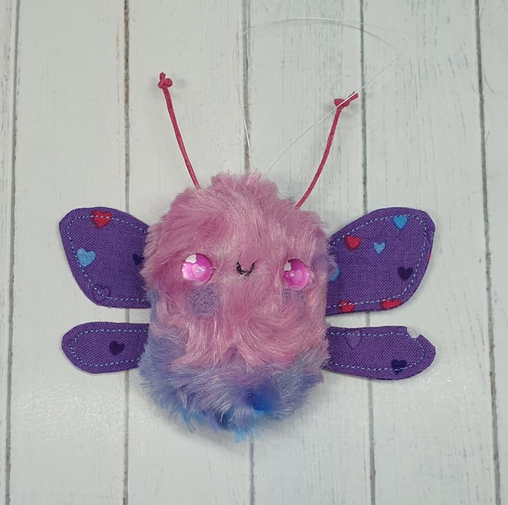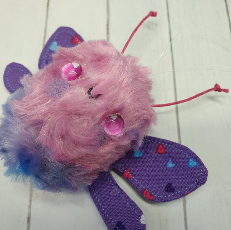 Small muti coloured plush love Bug with glass eyes and heart print wings. Wings are sewn into place. Love Bug has waxed thread antenna and hand embroidered smile. Love Bug comes with transparent loop hanger and measures roughly 7cm tall with a 10cm wingspan. This listing is for one love Bug only. This is for decorative purposes only and not a toy.