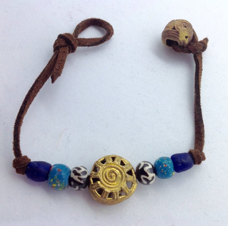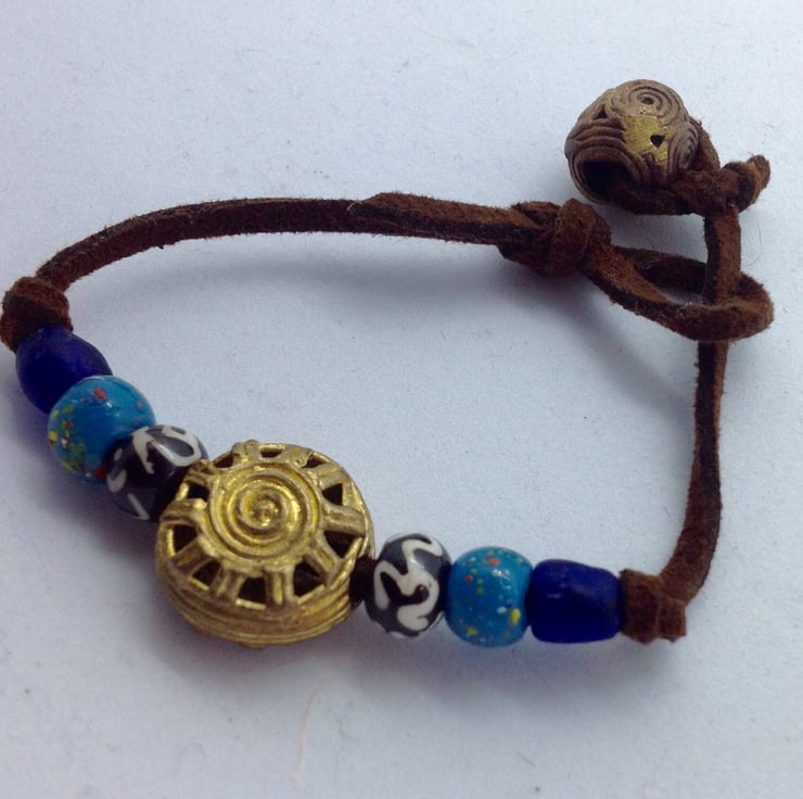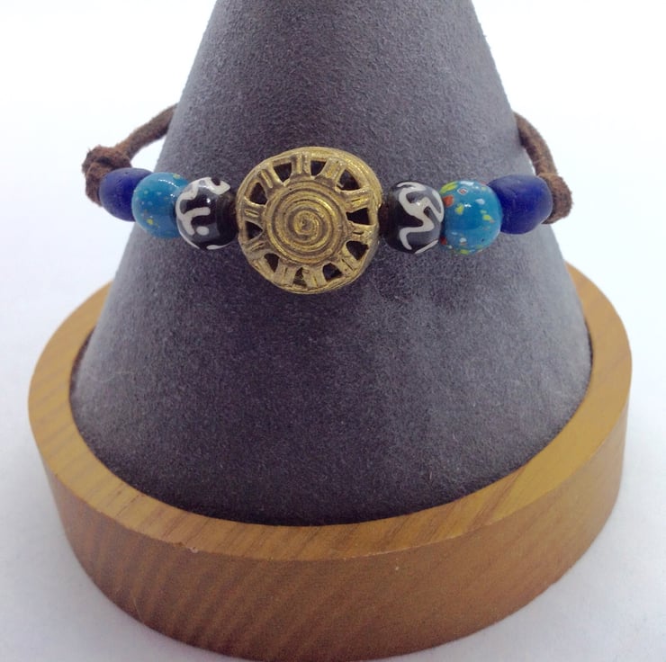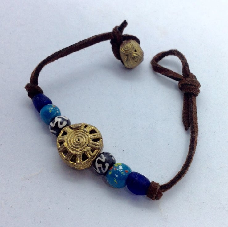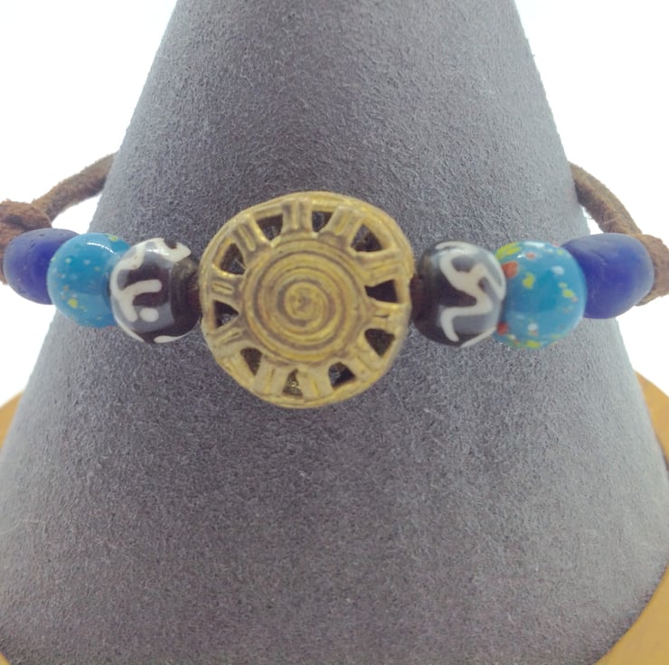This one-off cord bracelet is made with a central handmade bead of recycled brass from Ghana. There are a pair of vintage Tibetan prayer beads, some Himalayan 'end of day' beads and blue beads of recycled glass. They have been threaded onto faux suede, which is stronger than real suede and vegan-friendly! Another handmade African brass bead has been used for the fastening and you can move the knot on the loop along to adjust the fit.
