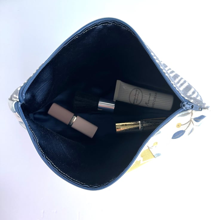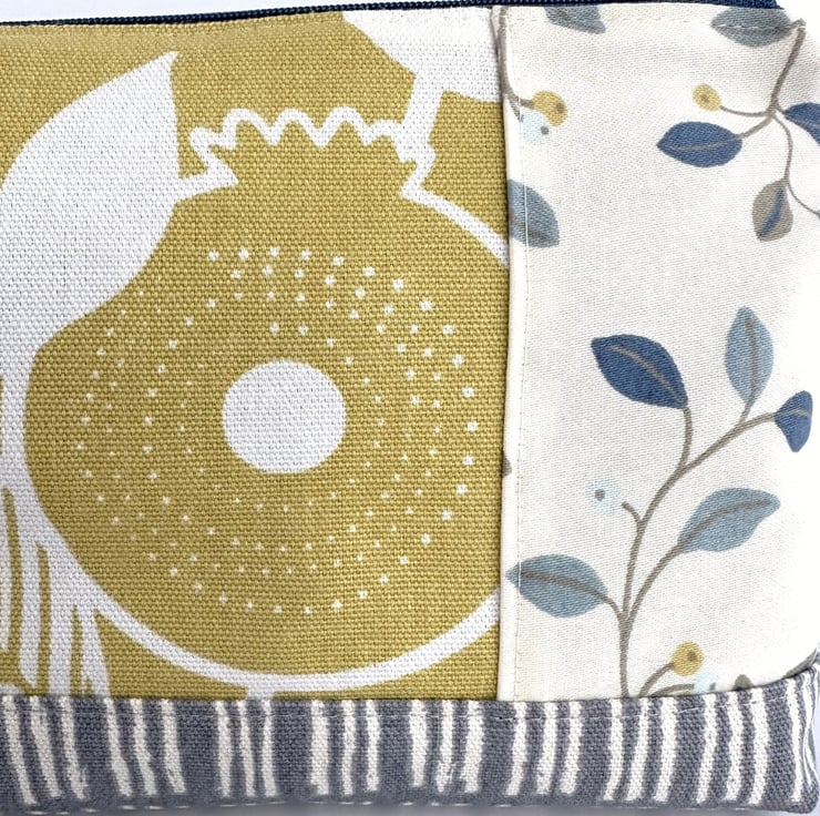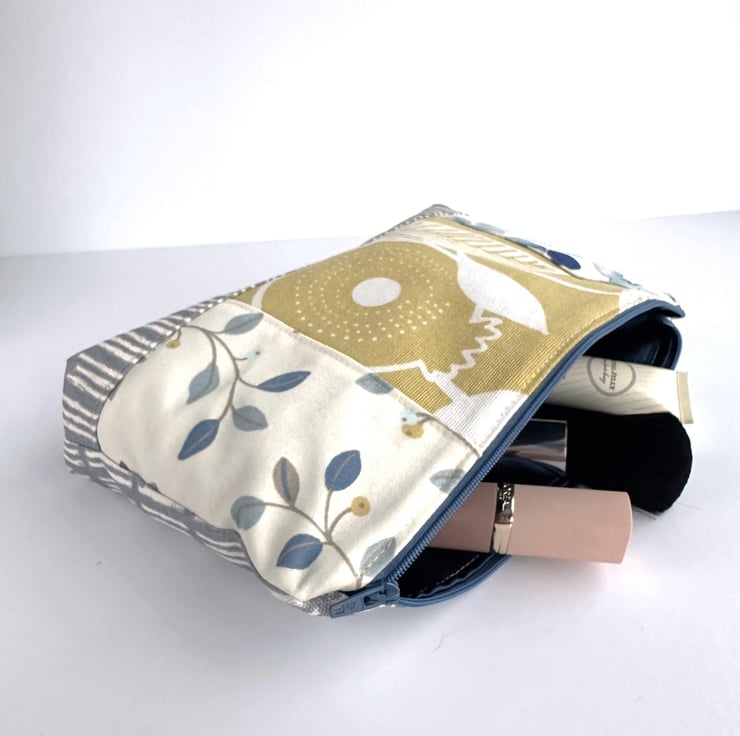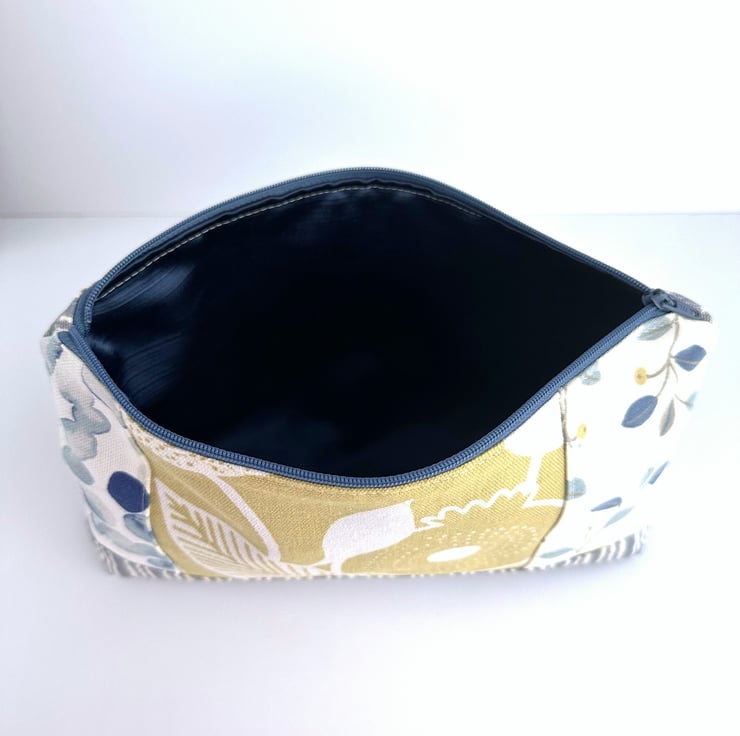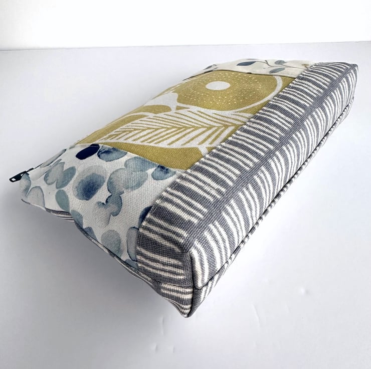 This lovely large sized make up bag is made from four print fabrics. The front of the cosmetic bag consists of four patchwork panels. The upper section is made up of a central panel flanked by two smaller panels. The central panel features a lovely white Scandi style floral and leafy pattern on a mustard yellow background. One of the flanking panels is cream with a pattern of leaves and berries depicted in shades of blue, grey and mustard yellow. The other flanking panel is made from white fabric with a pattern of irregular spots in shades of blue and grey. The lower section of the front, and the entire back, are made from grey fabric with a repeating pattern of blocks of three short white stripes. The make up bag fastens with a matching blue zip and is lined with blue satin fabric. The base of the bag is boxed giving lots of space inside.
