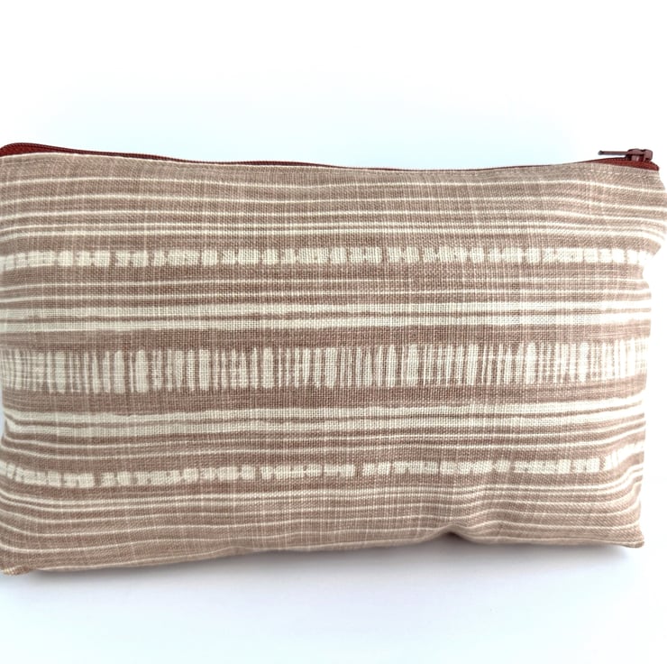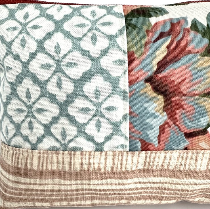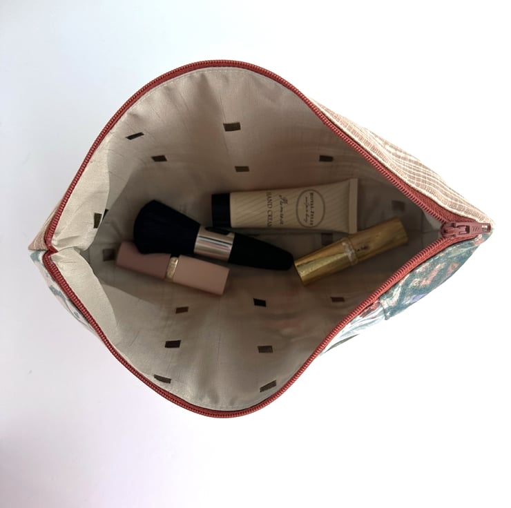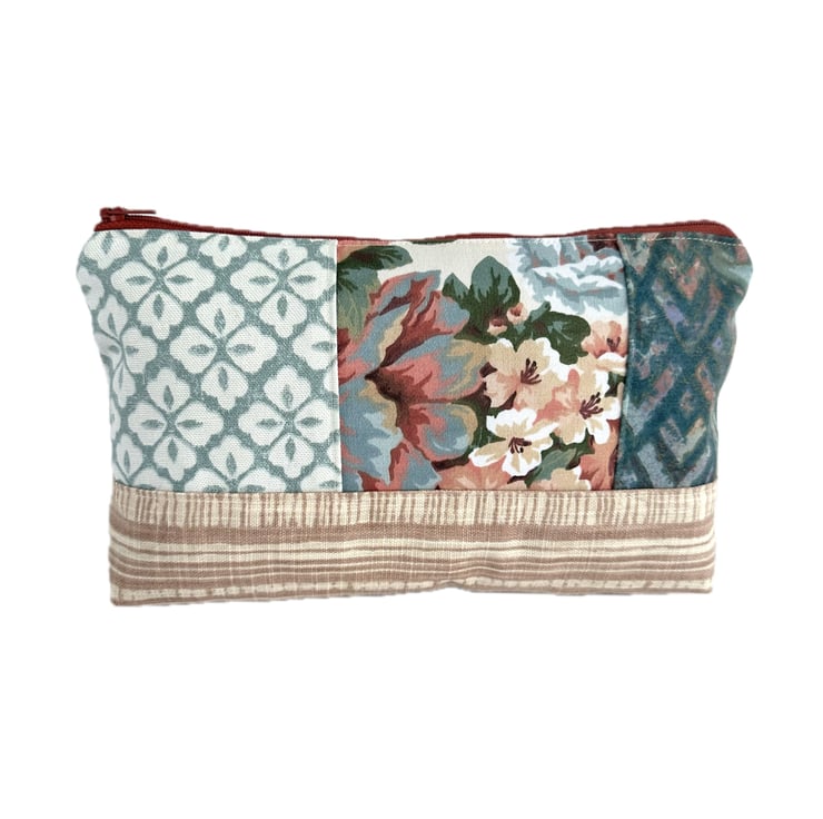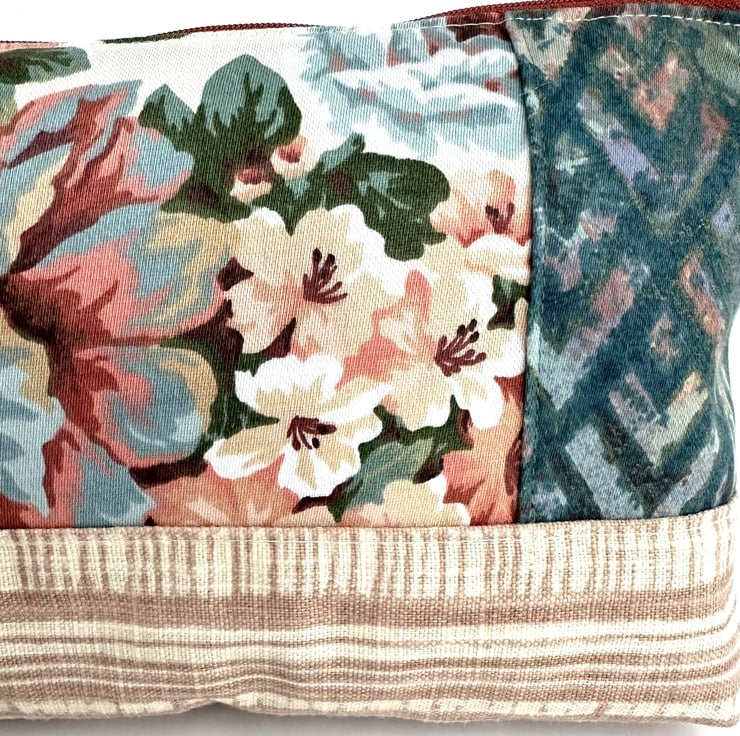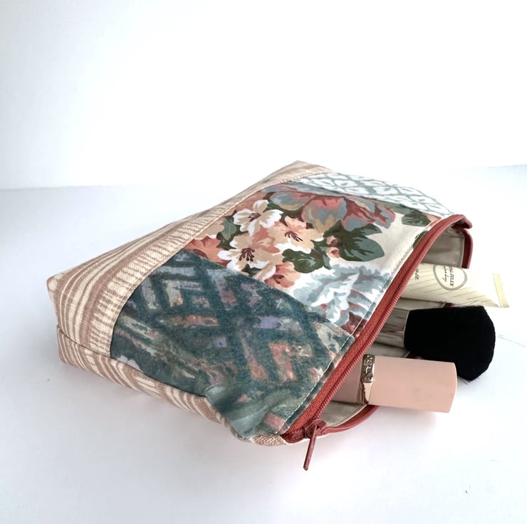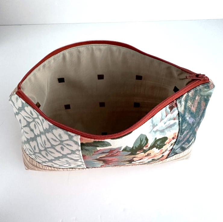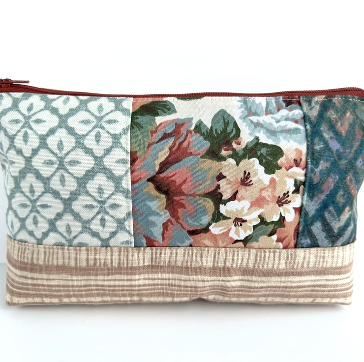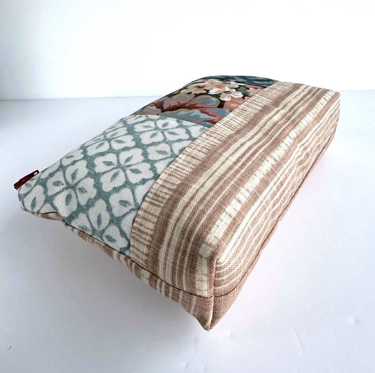 This lovely large sized floral make up bag is made from four print fabrics of co-ordinating colours. The front of the cosmetic bag has four patchwork panels. The upper section is made up of three panels of different widths. The central panel features a floral pattern depicted in shades of peach, terracotta, duck-egg blue, salmon pink, green and white. One of the flanking panels is made from duck-egg blue fabric with a geometric repeating pattern of white four-petalled flowers. The other flanking panel is made from jade green fabric with an abstract pattern of pale blue, pale pink and lilac chevrons with gold detailing. The lower section of the front, and the entire back, is made from striped fabric in cream and a pale terracotta colour. The make up bag fastens with a terracotta zip and is lined with taupe fabric with a woven pattern of small squares. The base of the bag is boxed to give more room inside.