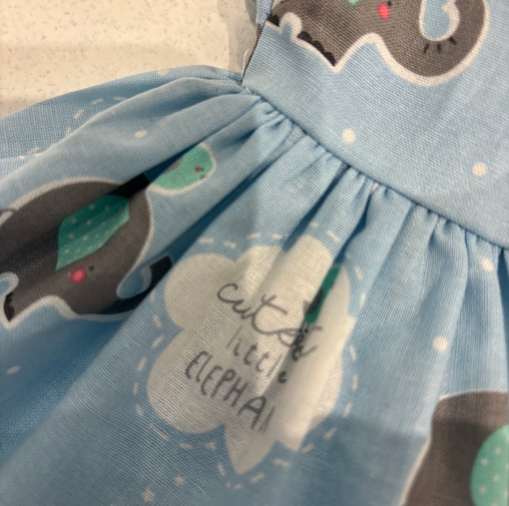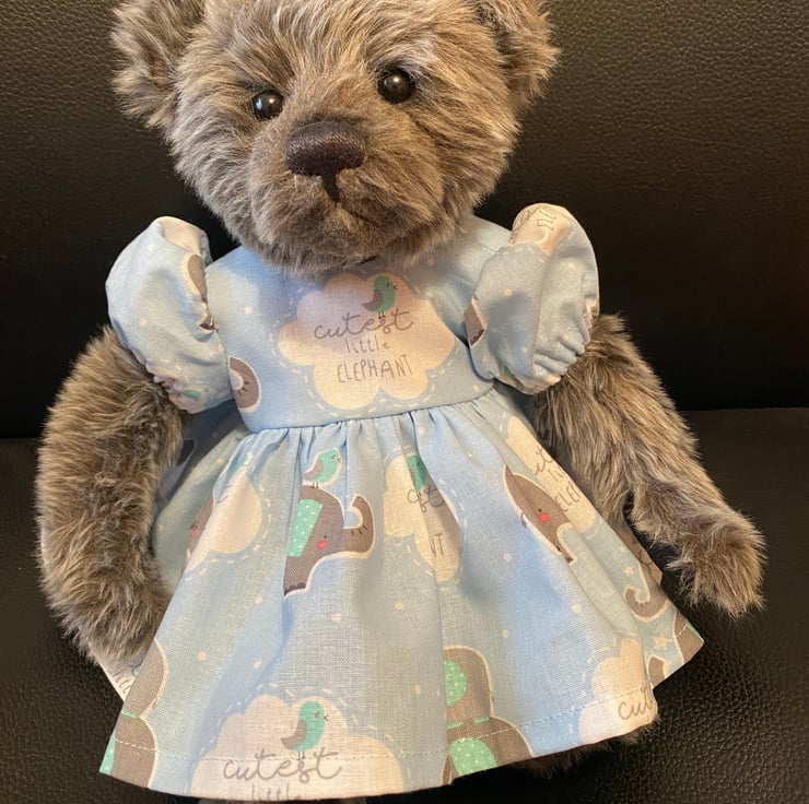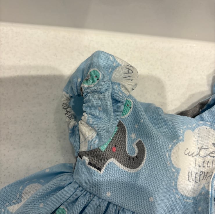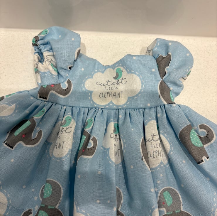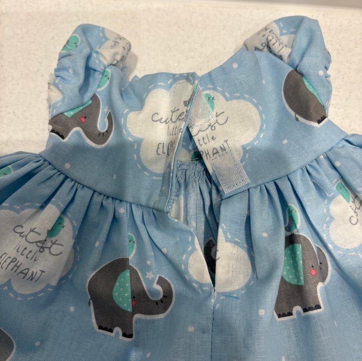 This cute blue elephant dress is a small size. Approx size 12”/31cm tall. Suitable for a baby doll. The puff sleeves are elastic. The dress is generously gathered onto a lined bodice, making it full in style. The print features elephants, the dominant colour is blue.