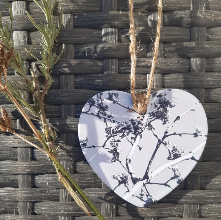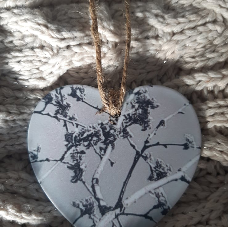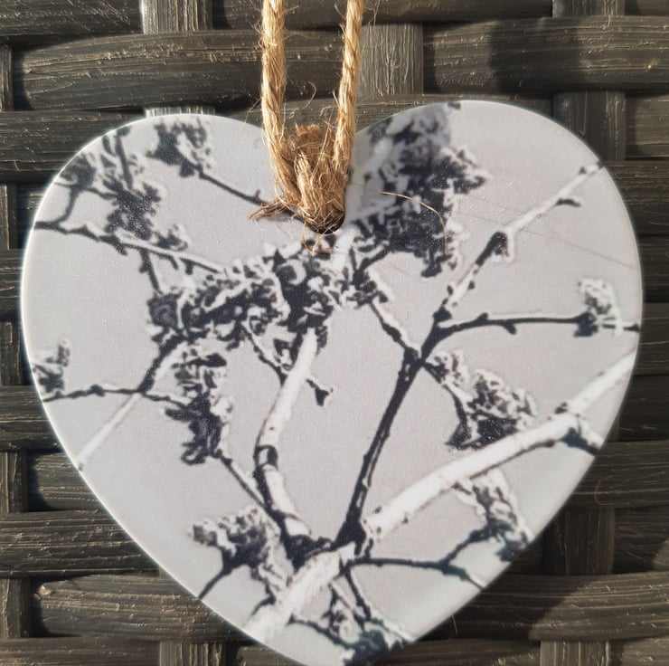 Delicate hanging heart made from polymer and printed on both sides with my original photographic design using a process called sublimation.