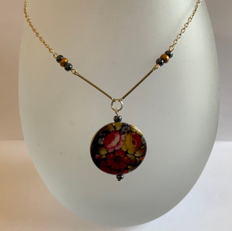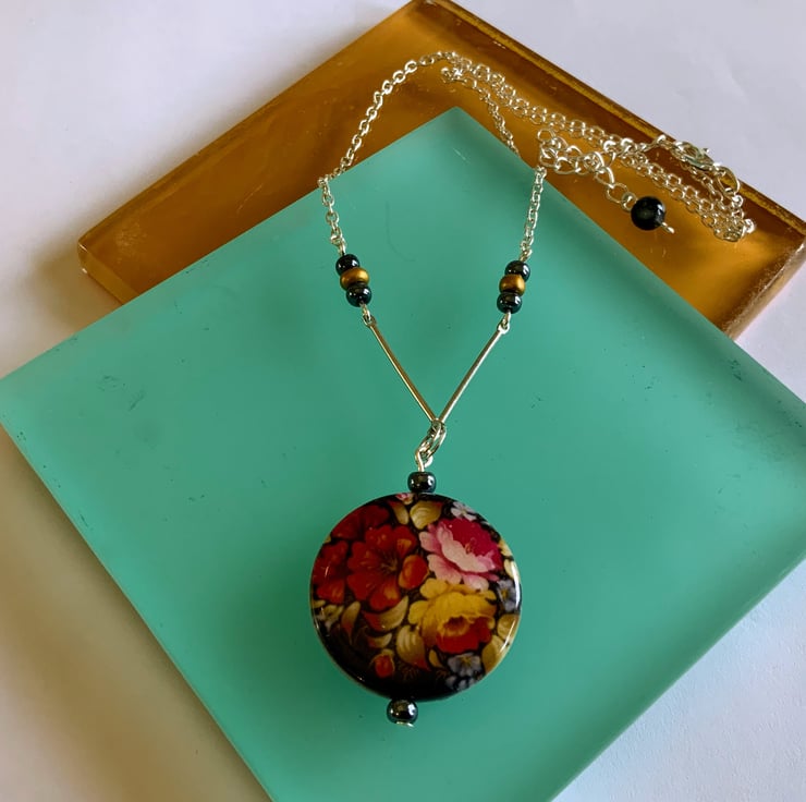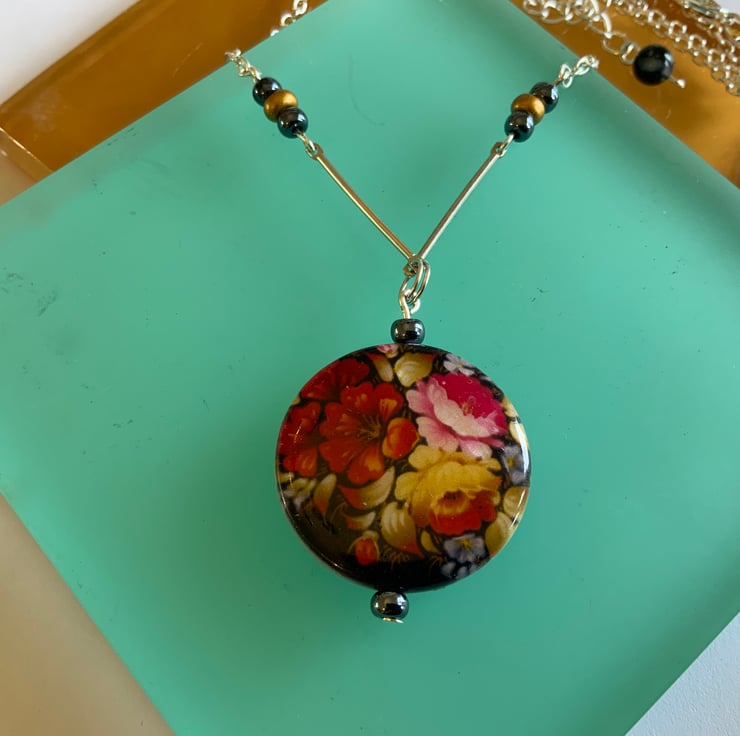 This large flat flower bead is striking with it's aray of vibrant colours on a black background. It is an oldy worldy design with vintage flair. It stands out on a modern design necklace featuring two stainless steel rod bar pins that fan out on your neck line with metalic mini rochelle beads that reflect beautifully in the light.