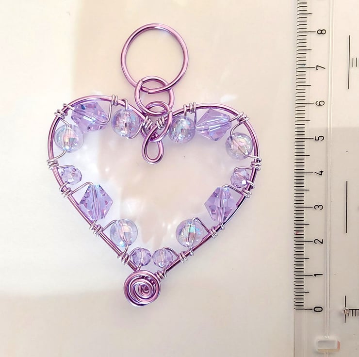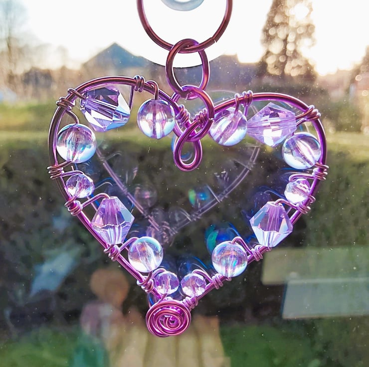 I made this with lilac coloured aluminium wires and lilac coloured crystal and acrylic beads, it sparkles beautifully when hung in the window or you can use it as a car charm to hang from your rear view mirror.