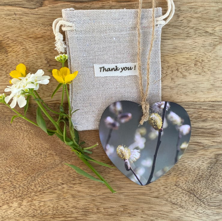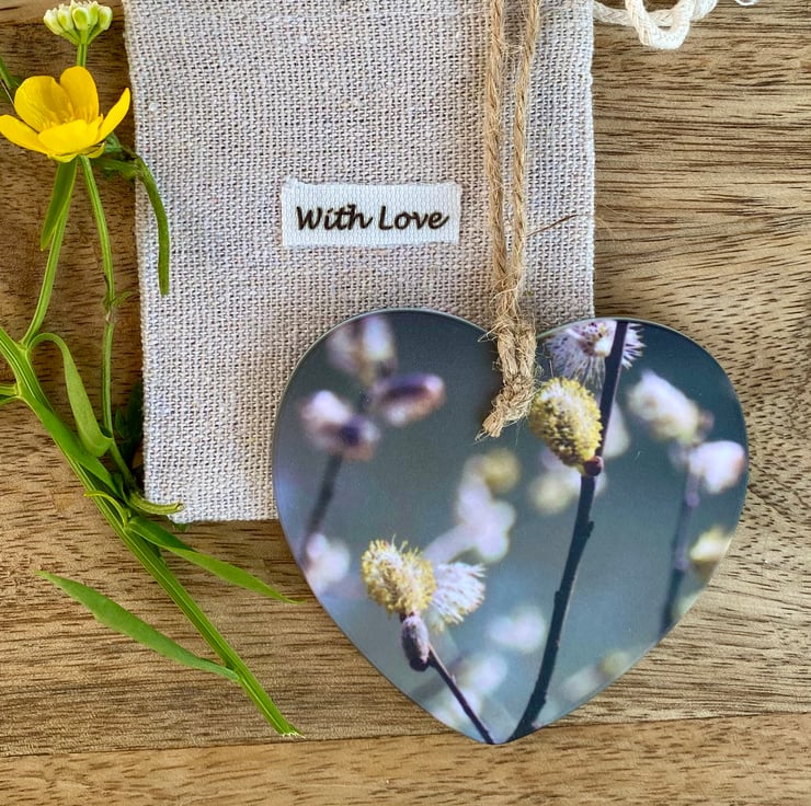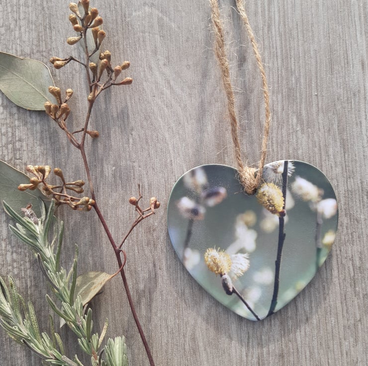 Hanging heart decoration - keepsake - letterbox gift -Green willow catkin print.