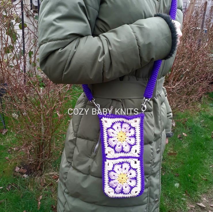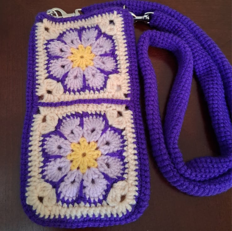 Crossbody phone bag made in granny squares. Purple bag with lilac flowers on each side. Comes with a gusset so can be used for your phone and a small wallet/keys.