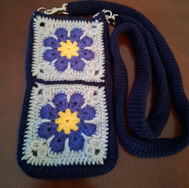 Crossbody phone bag made in granny squares. Navy blue bag with mid blue flowers on each side. Comes with a gusset so can be used for your phone and a small wallet/keys.