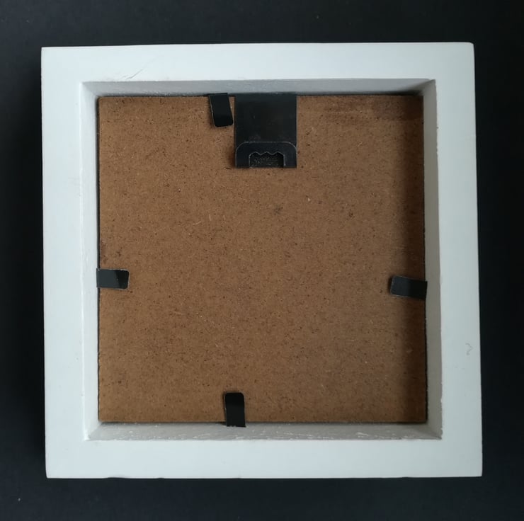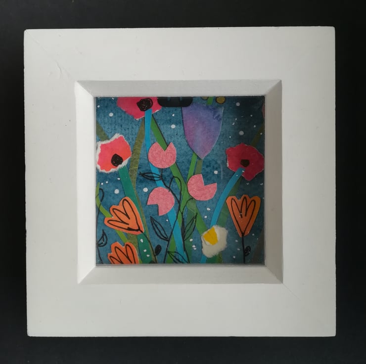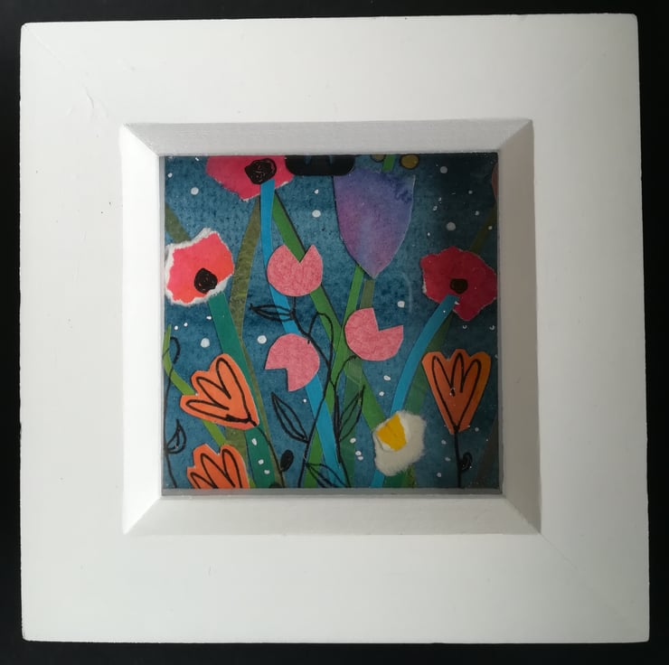 A pretty piece of vibrant, collaged flowers set in a small, square, white box frame.