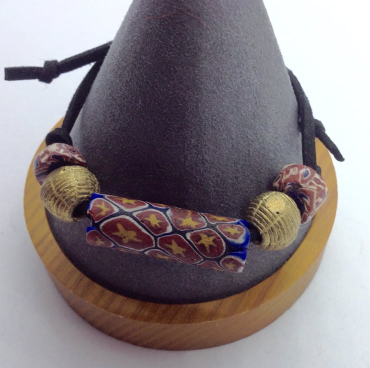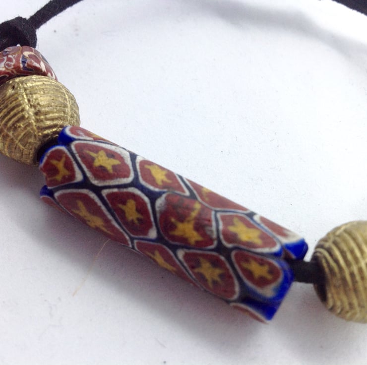The large central glass bead would have been made in or around Venice between about 1880 and 1920, then exported to Africa to be used as currency. As such, these beads bear the scars of their travels in the form of small chips to the glass but these are just part of their history and don't take away from their beauty - please judge from the photos.