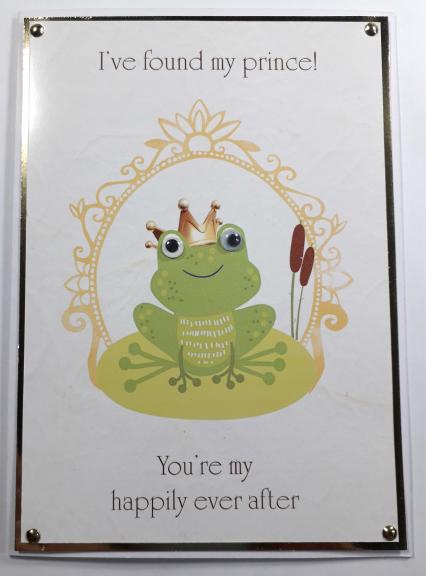 The frog wears a crown and sits in a fancy frame with bulrushes to one side, I have added the word "I've found my prince" to the top of the card and "You're my happily ever after" to the bottom, there is a gold brad in each corner, and the frog has googly eyes.