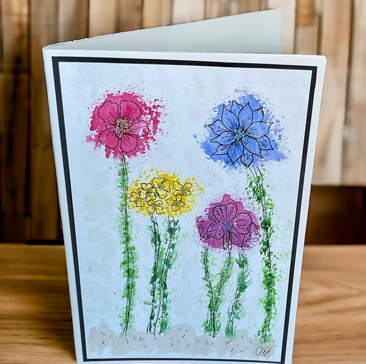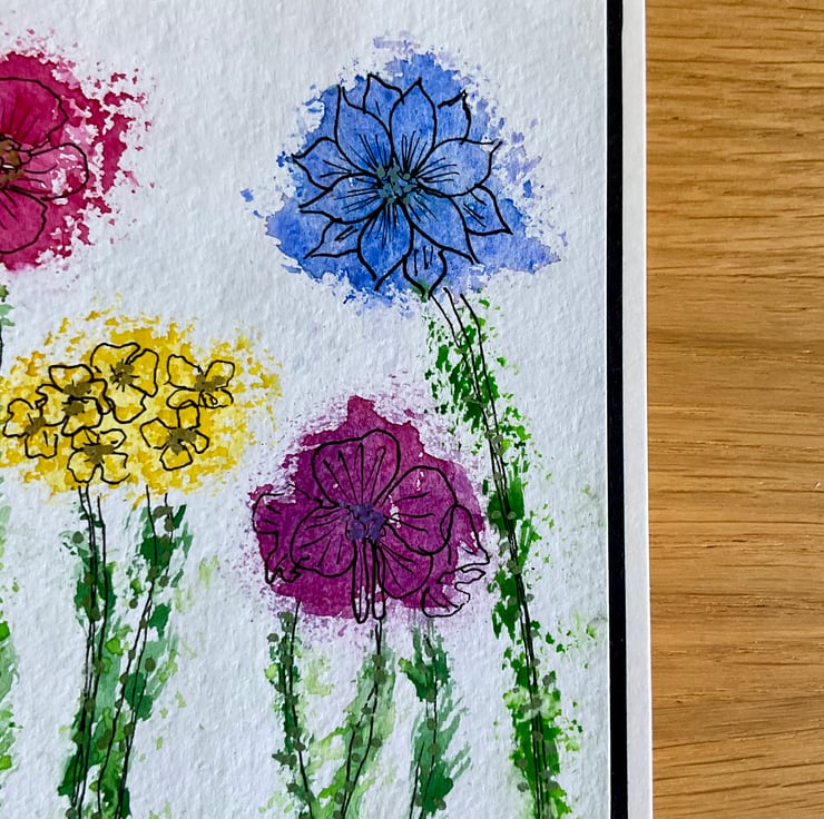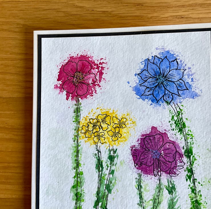 This card features hand drawn abstract flowers which have been coloured using watercolour paint and finished with metallic highlights.