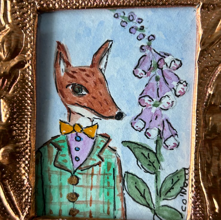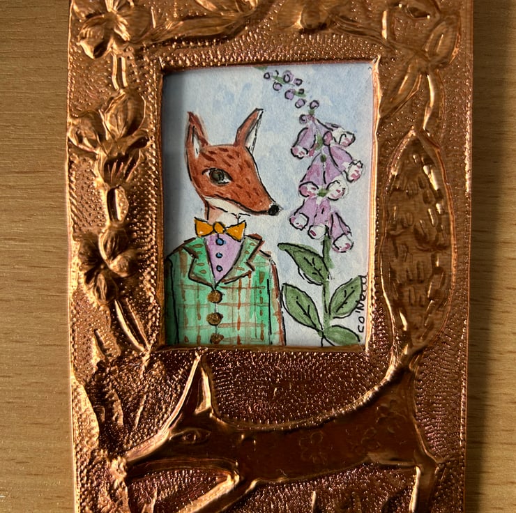 The frame is embossed with flowers and a little fox. The water colour painting is covered with a piece of perspex.